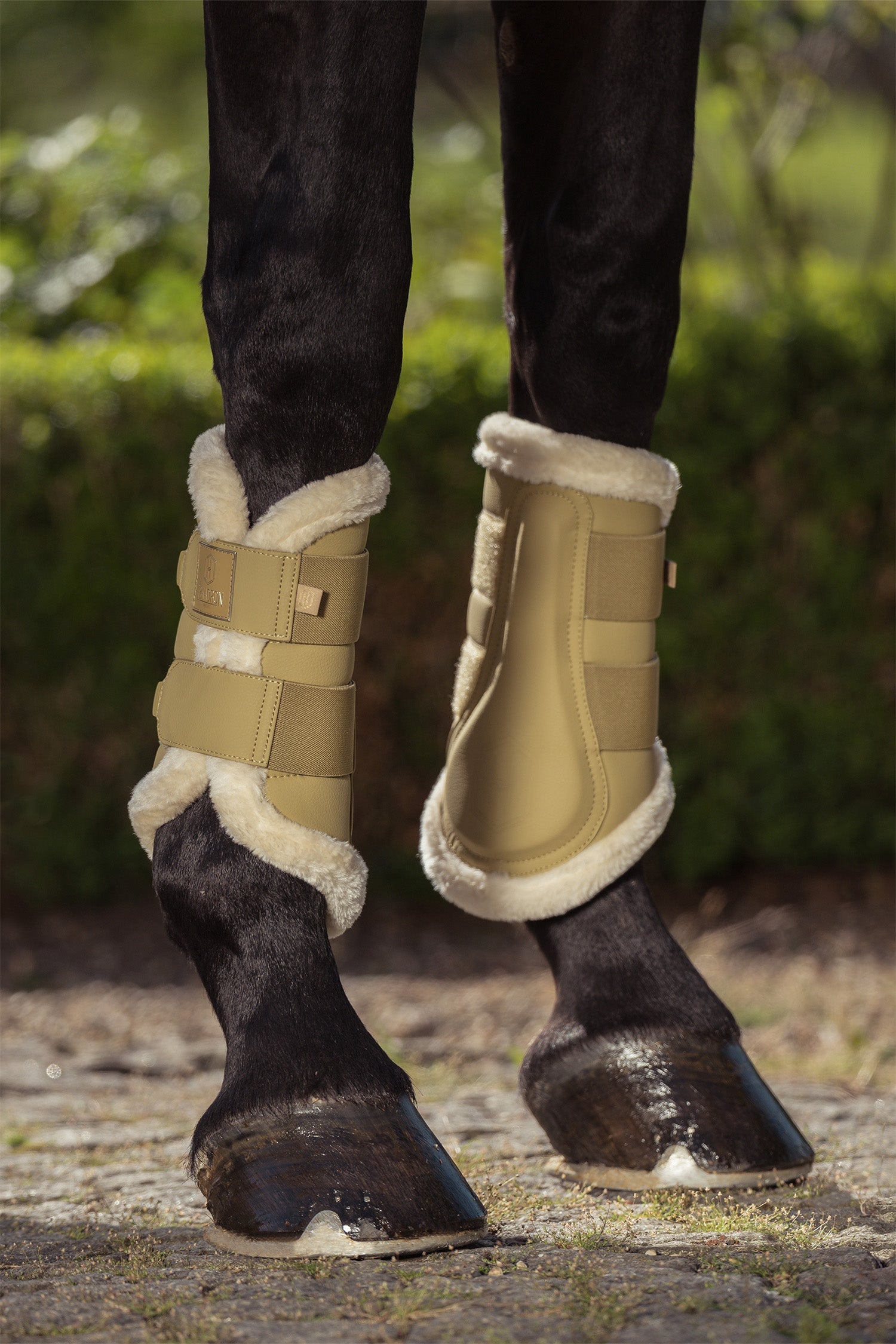 Den mjuka fuskpäls­kanten runt kanterna minskar risken för skav och gör skydden extra bekväma, även för känsliga hästar. Elastiska kardborreknäppningar gör dem enkla att ta på och av, samtidigt som de ger en säker, justerbar passform. Heritage-emblem och liten flaggetikett sätter en elegant finish.