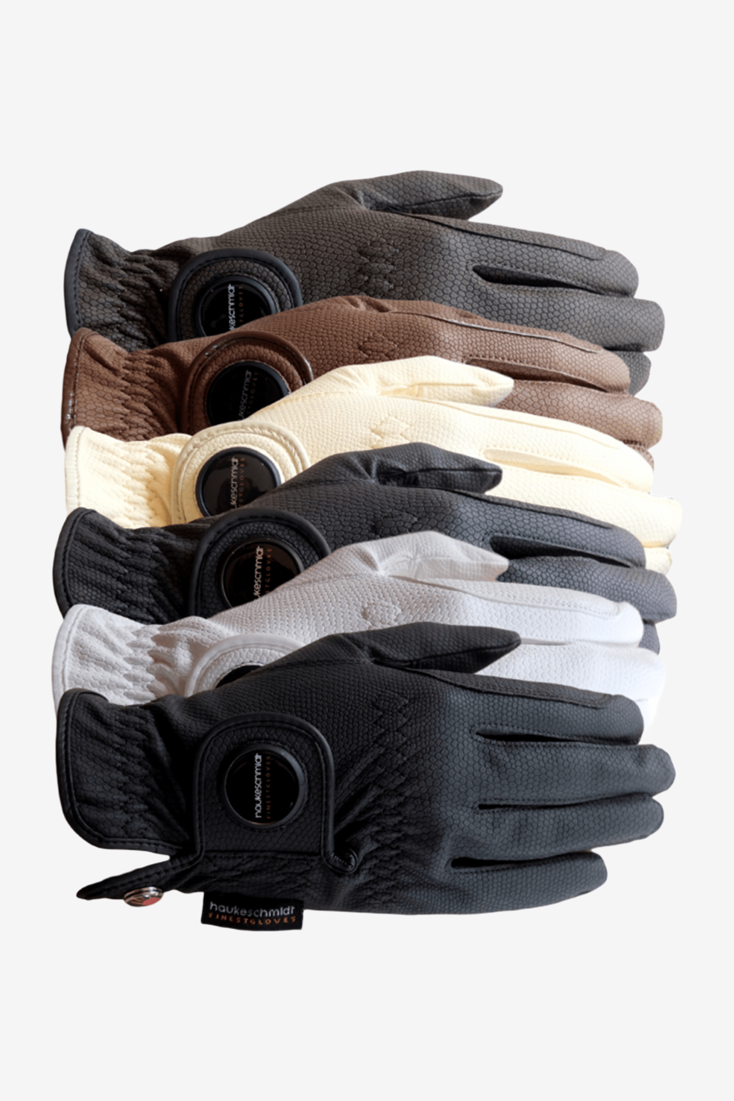 Fantastisk ridhandske från Hauke Schmidt i bra kvalitet. Handsken är tunn vilket ger en oöverträffad känsla i tyglarna till hästens mun. Den har bra grepp och en skön nära passform med förstärkningar vid tygelområdet. Handsken har resår på ovansidan av handryggen som anpassar sig efter varje hand. Den andas och är väldigt hållbar. Handsken stängs med ett smidigt kardborrespänne och har en snygg Hauke Schmidt-logotyp.