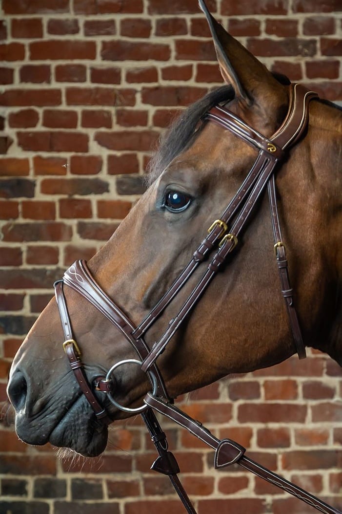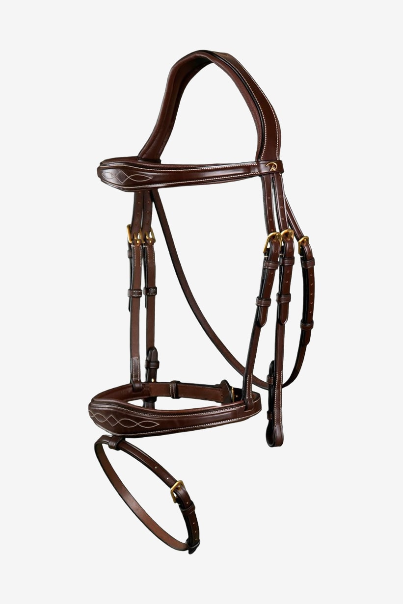 Träns från Dyón – Dyón Collection. Anatomiskt träns med anatomisk nosgrimma med underrem, vit mönstersöm på pannband och nosgrimma, pannbandet är bredare på mitten för att matcha nosgrimman. Mässingsspännen. Dyóns nya träns kombinerar komfort med stil och är tillverkat av det finaste lädret. Nackstycket är lite bredare med en utskärning för öronen och är vadderat med 2 mm neopren. Tränset har tre remmar – för nosgrimman, sidostycket och käkremmen. För att undvika tryck som orsakas genom att nosgrimman trädes över nacken, sätter man fast nosgrimman direkt i tränsets tredje sidorem.