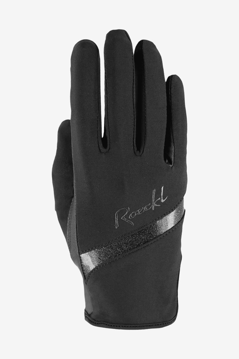 En stilfuld ridehandske i trendy design. Diskret glitterlogo med et skinnende bånd på håndryggen. Særligt tilpasset den kvindelige hånd. Blødt, silkeblødt nylon med et højt indhold af elastan på håndryggen for maksimal komfort og perfekt pasform, der giver meget god bevægelighed for hånd og fingre. Derudover tørrer den meget hurtigt og har en høj åndbarhed.
