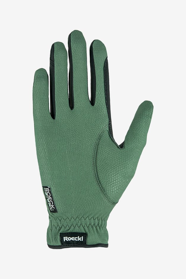 Roeckl-Grip er et eksklusivt materiale med ekstremt høj åndbarhed, meget elastisk og utroligt blødt. Det giver med andre ord følelsen af en ekstra hud, samtidig med at det tilbyder et fantastisk greb om tøjlerne. Handskerne fremstilles i München, og skrædderne lægger stor vægt på kvaliteten; de forskellige dele på handskerne er omhyggeligt syet sammen i hånden. Velcrolukning på håndryggen med det karakteristiske hånd-logo sikrer en omsluttende og behagelig pasform.
