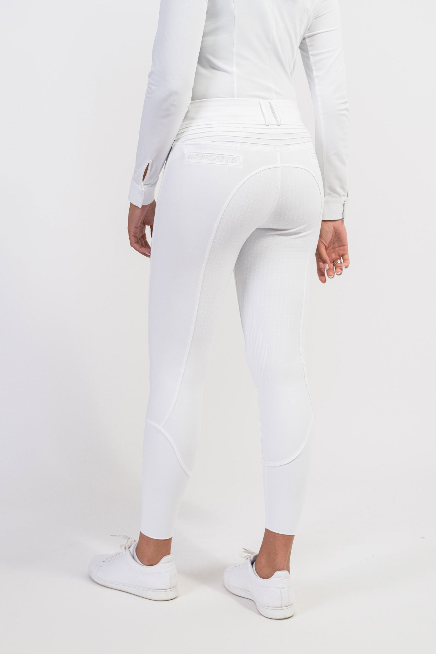 Ridebukser Clara er et elegant, stilfuldt og moderne valg for ryttere, der leder efter bukser med høj talje. Ridebukserne er lavet af firevejs stretch italiensk materiale, der giver en anden hudkomfortabel følelse for rytteren med enestående bevægelsesfrihed. Fuldskindet model med silikone i et stilfuldt mønster giver et fast greb i sadlen. Ridebukserne har også silikone på indersiden af linningen, der hjælper med at holde trøjen på plads. Alt for at du kan fokusere optimalt på ridningen uden at skulle tænke på tøjet.