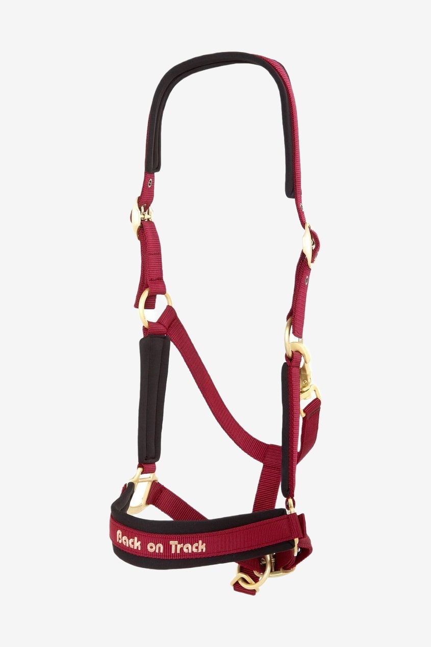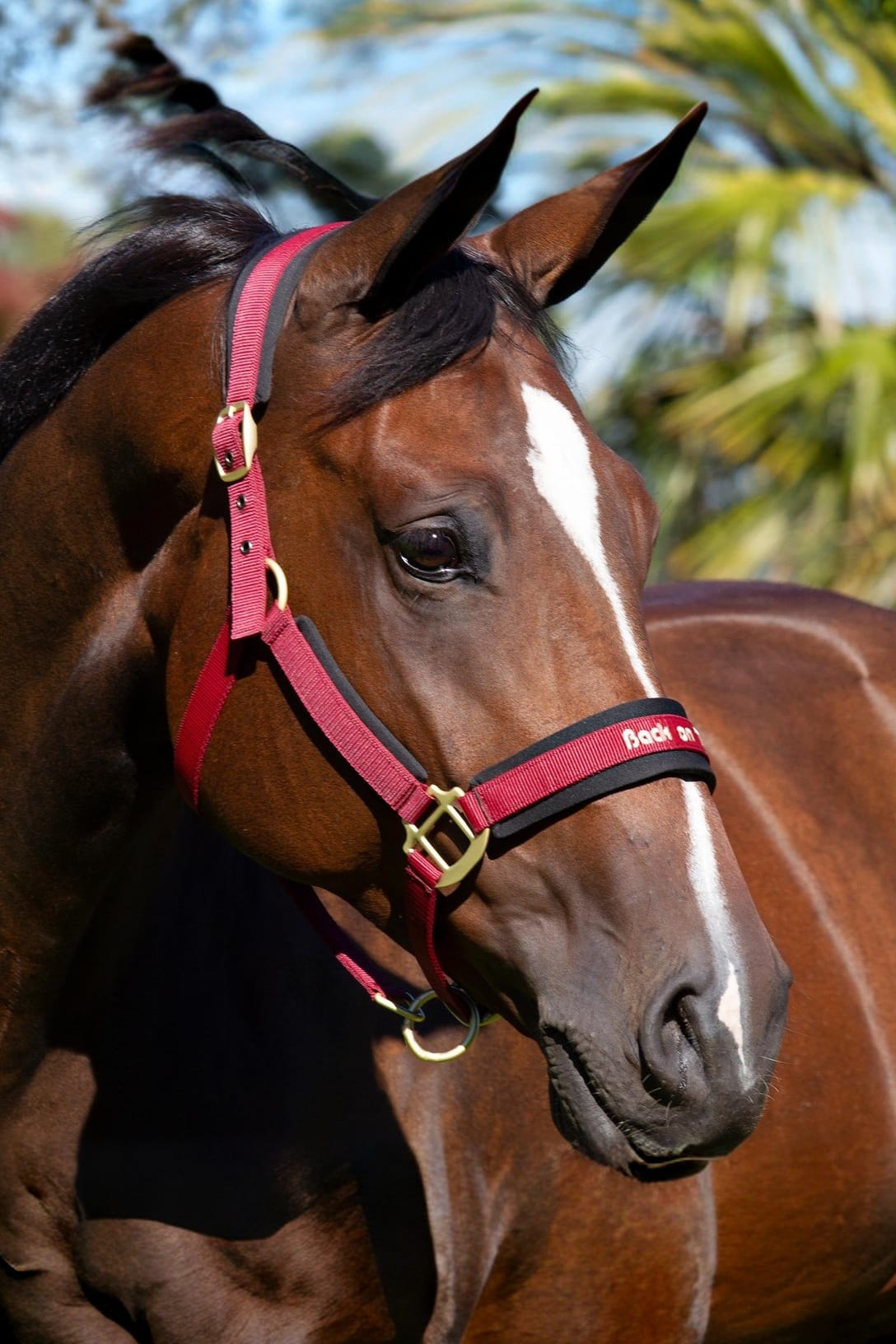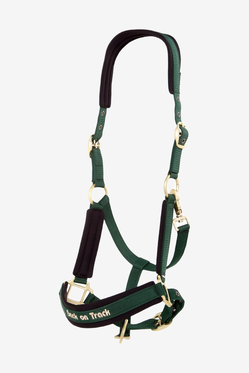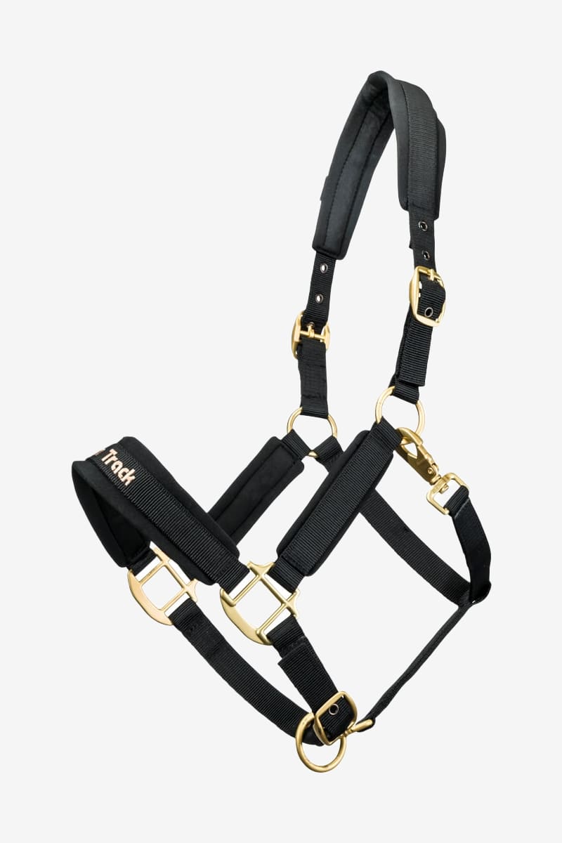 Grimman är brun med eleganta, guldfärgade metallspännen. Enkel justering och tillpassning till din hästs storlek både vid sidostycken och runt nosen. Smidig att stänga med en karbinhake.