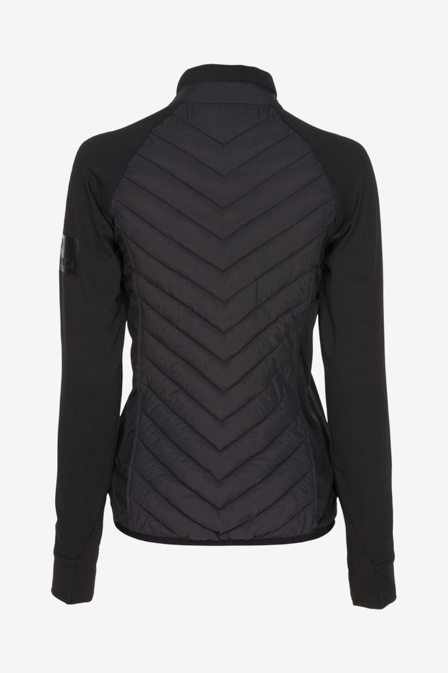 Hybridjacke von Equipage in zwei Lagen, die wärmende Wattierung an Vorder- und Rückseite mit elastischem Funktionsmaterial an den Seiten und Ärmeln kombiniert. Die ergonomische Passform macht sie besonders geeignet für das Reiten und andere Outdoor-Aktivitäten, bei denen gute Bewegungsfreiheit erforderlich ist. Die Jacke ist mit einem hohen, schützenden Kragen, zwei praktischen Seitentaschen mit Reißverschluss, Daumenlöchern an den Ärmelenden, die die Ärmel an Ort und Stelle halten, sowie einem durchgehenden Reißverschluss für verstellbare Belüftung ausgestattet.