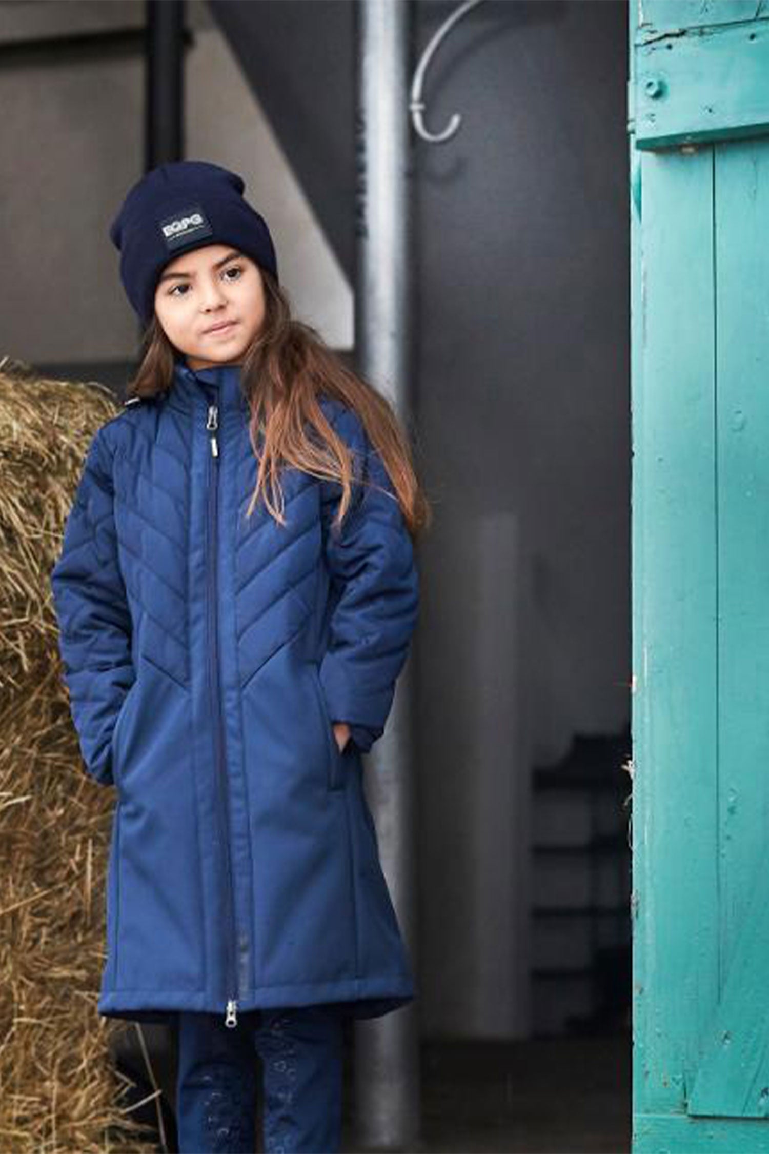 Equipage Junior Gaia Jacke Navy. Jacke im Hybrid-Design mit gestepptem Oberteil und Ärmeln sowie einem unteren Teil aus Softshell. Das Außenmaterial ist wasserabweisend und hält leichtem Nieselregen stand. Das Hybridmaterial macht den Mantel leicht und flexibel, und er kann problemlos unter einem dickeren Mantel getragen werden, wenn es kalt wird. Zwei-Wege-Reißverschluss vorne und eine abnehmbare Kapuze, die zudem mit elastischen Bändern verstellbar ist.