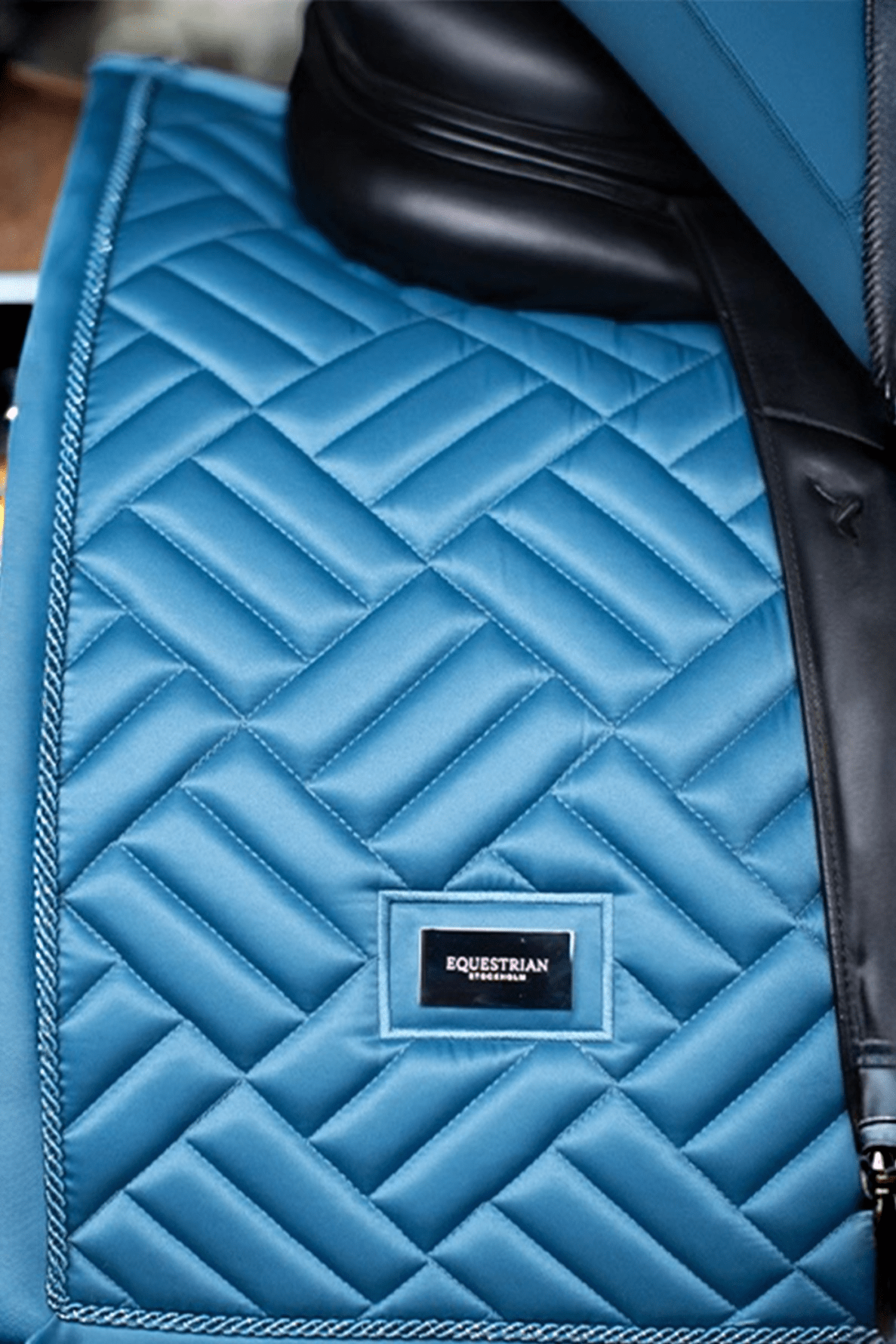 Stilvolle und elegante Unterlage mit Labyrinth-Steppung. Die Farbe ist ein schönes Blau mit silbernen und weißen Details. Das Equestrian Stockholm-Logo ist in Silber gehalten.