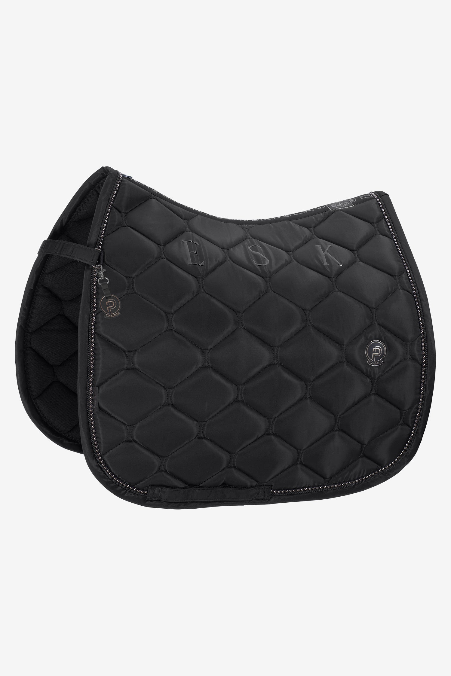 Die Oberseite besteht aus hochglänzendem, schmutzabweisendem Material mit einer dezenten Perlenkordel, die einen luxuriösen und dennoch raffinierten Look verleiht. Die Innenseite ist mit Eskadrons cool/dry-Material gefüttert, das atmungsaktiv ist und Feuchtigkeit effizient vom Pferderücken ableitet. Der anatomische Schnitt sorgt für optimale Passform und Druckverteilung.