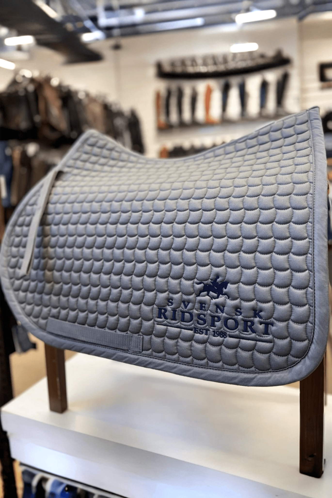 Dünne und flexible Schabracke aus Baumwolle mit kleinen Karos. Verstellbarer Riemen zur Befestigung an den Gurtstrupfen. Gesticktes Svensk Ridsport-Logo in Schwarz auf der linken Seite.