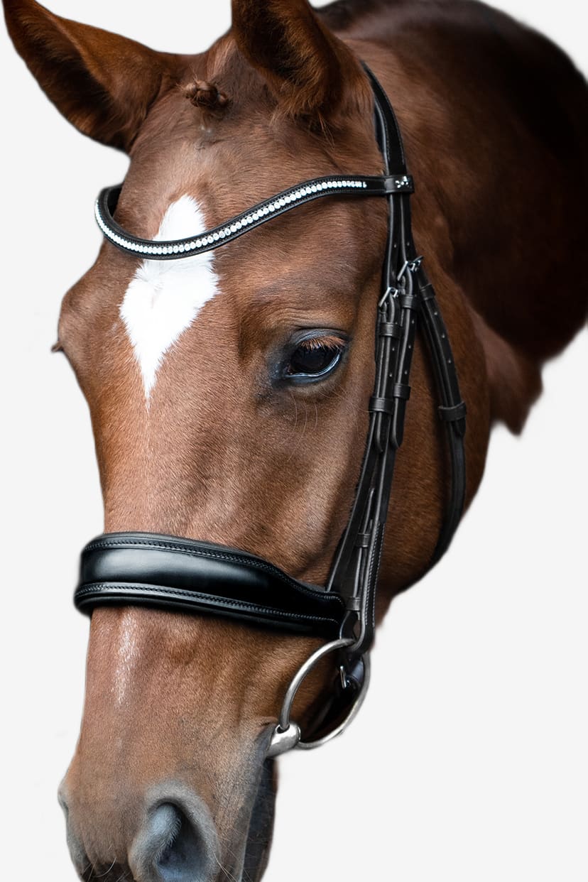 Slimford von Schockemöhle vereint Funktionalität und sportliches Design. Die Trense mit anatomisch geformtem Nasenriemen verfügt über ein einzigartiges und sehr weiches Genickstück für zusätzlichen Komfort. Das Genickstück ist speziell an die Anatomie des Pferdes angepasst und ermöglicht mehr Bewegungsfreiheit an den Ohren. Durch den reduzierten Druck auf die empfindlichen Bereiche rund um Jochbein und Genick wird der Komfort des Pferdes deutlich verbessert. Slimford ist mit zwei Stirnbändern ausgestattet: einem einfachen Stirnband aus Leder und einem mit einer dünnen Kristallkette. Zügel sind nicht enthalten.