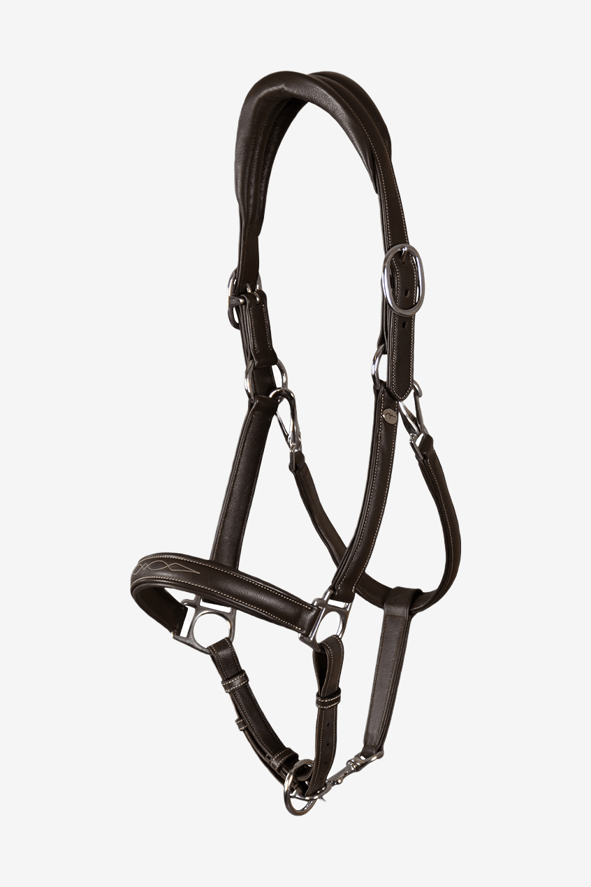Superfin och mycket mjuk 2-i-1 grimma tillverkad i buffalo läder med silverspännen och vit mönstersöm. Perfekt fingrimma som enkelt kan göras om till grooming-grimma.