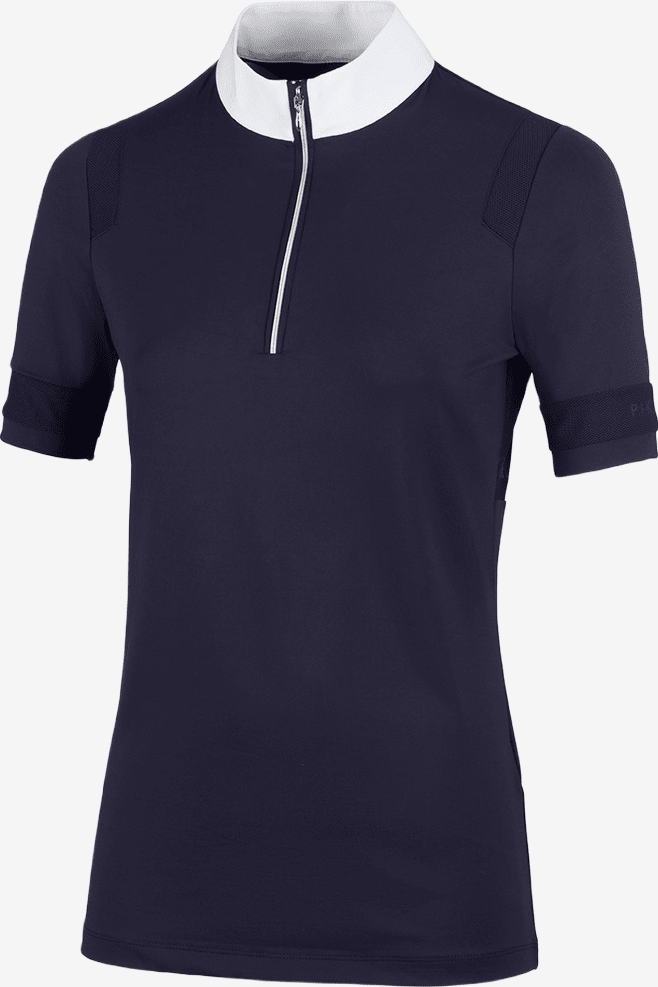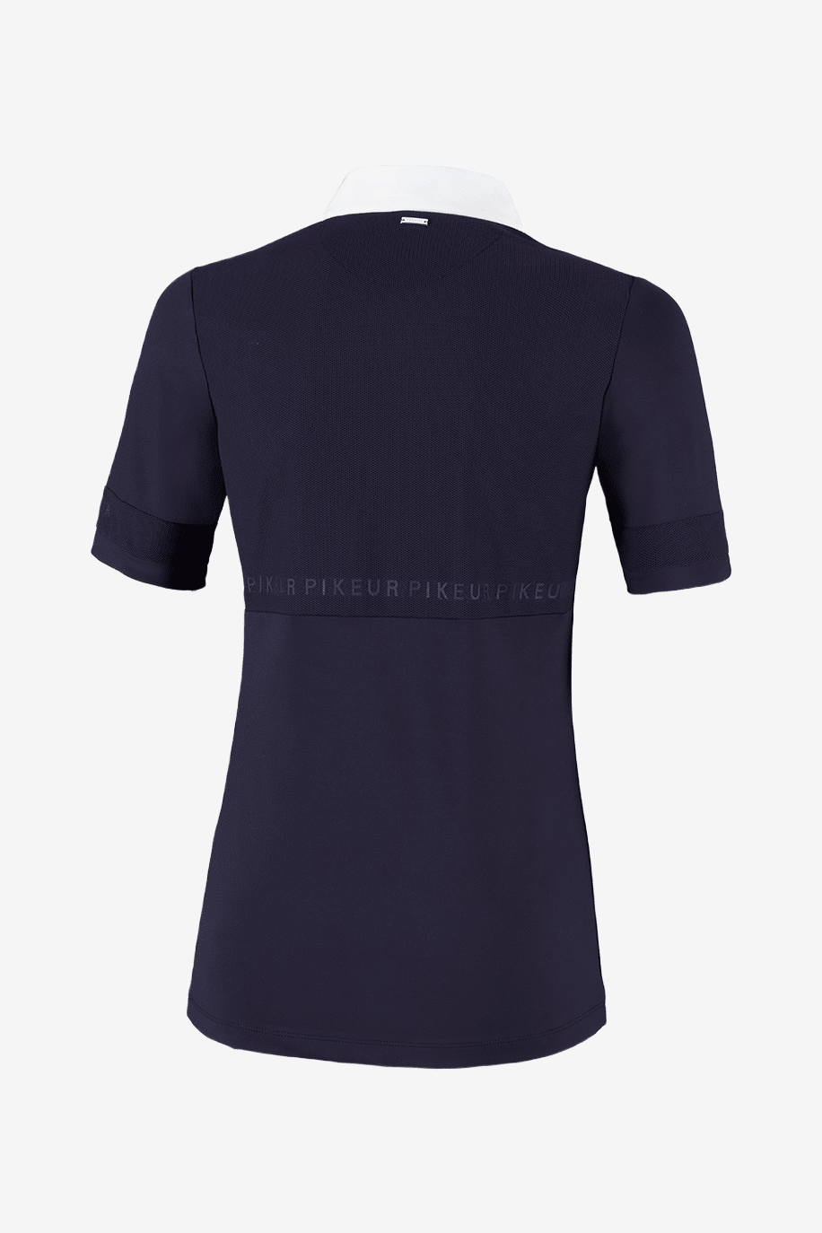 Ein stilvolles Turniershirt aus funktionalem Material, das sich kühl und leicht auf der Haut anfühlt. Es leitet Feuchtigkeit vom Körper ab und sorgt für angenehmen Tragekomfort. Mesh-Einsatz im oberen Rückenbereich als modisches und feminines Detail, außerdem Mesh-Details an den Ärmeln. Pikeur-Print in der Mitte des Rückens und am linken Ärmel. Kurzer silberfarbener Reißverschluss vorne.