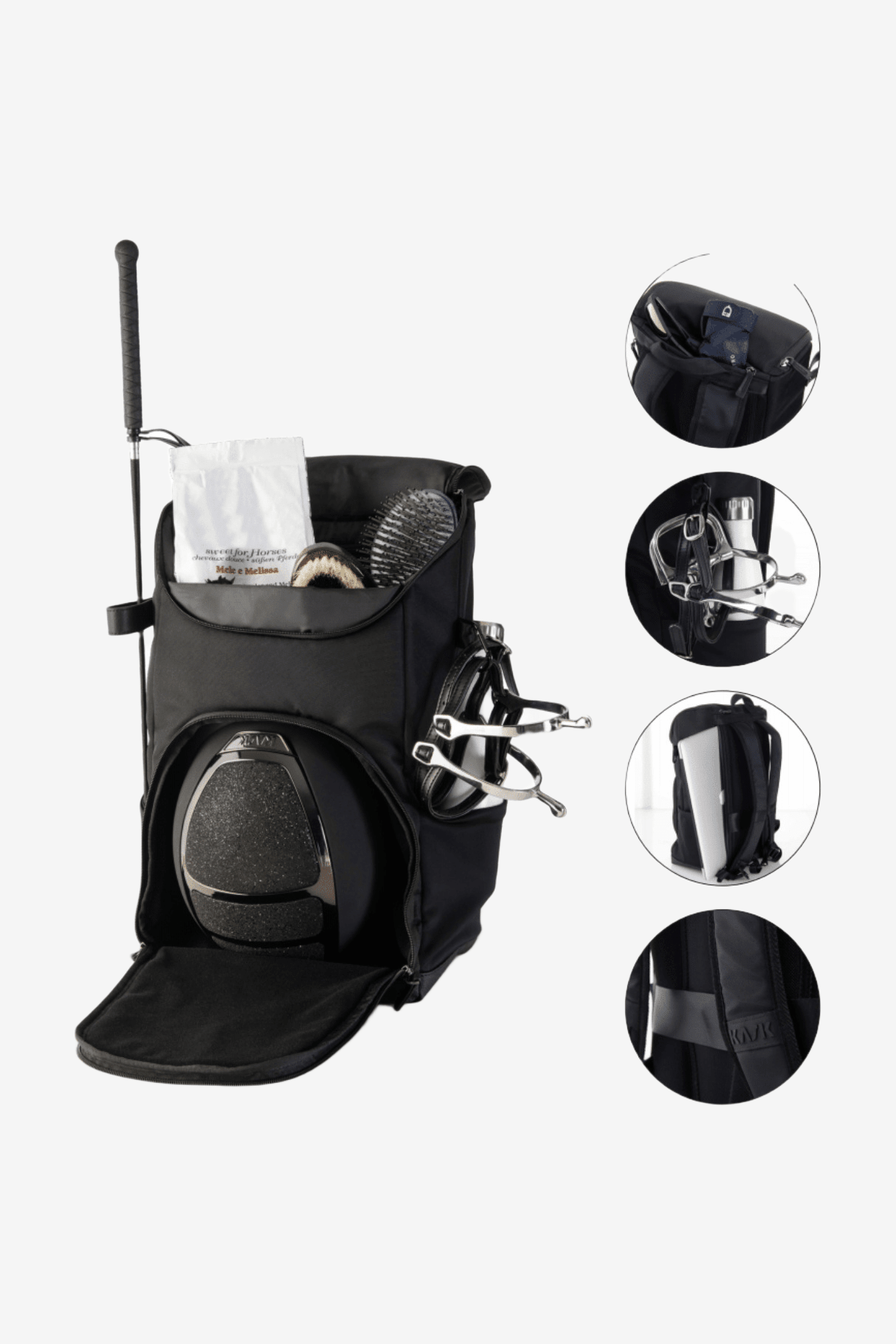 In addition to an extra whip holder, Vertigo has a holder for the spurs and the water bottle. You will also find a compartment for the riding helmet at the front of the backpack.