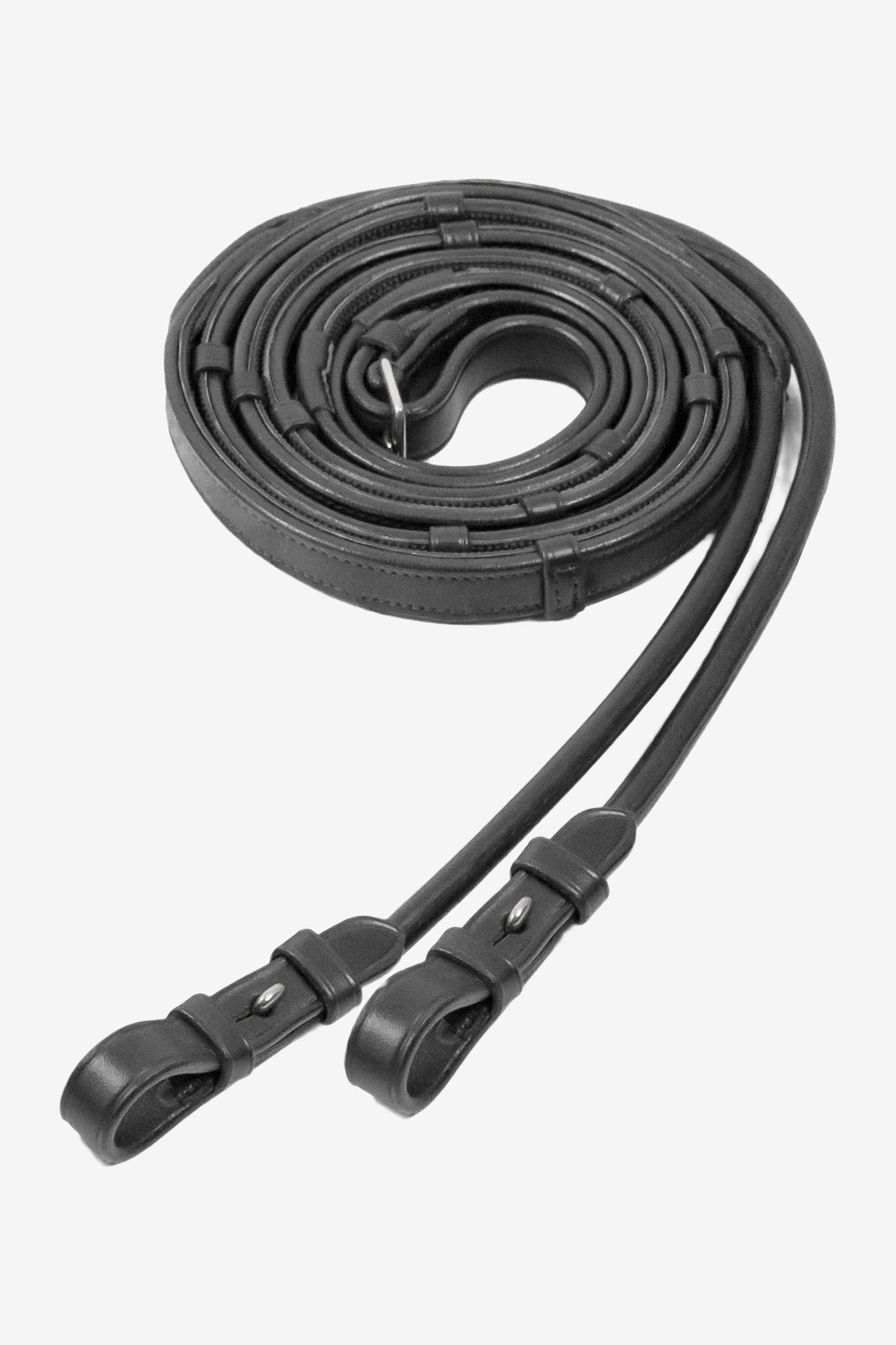 Traditionell tygel som är sydd med slätt läder på utsidan och klädd med gummi på insidan (med stoppar) för bästa grepp. En perfekt tygel för dig som vill ha en mjuk och följsam tygel som är enkel men med bra grepp. Rundsydda avslut för en elegant finish.