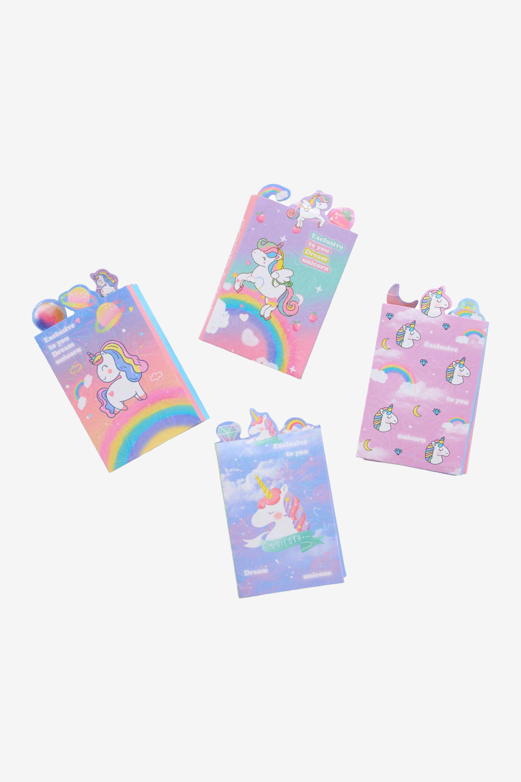 Small notebooks with cheerful motifs of unicorns with a glitter effect.