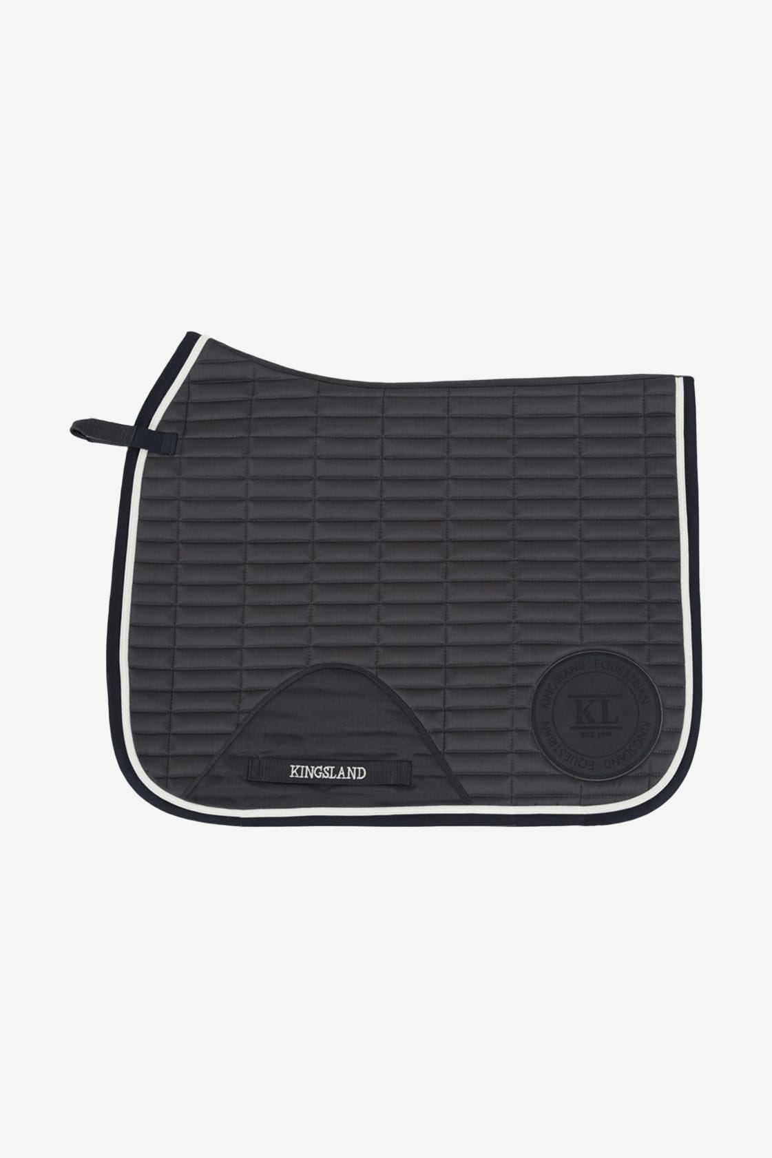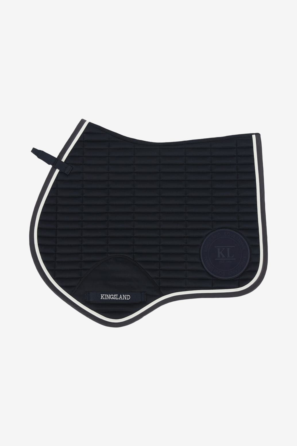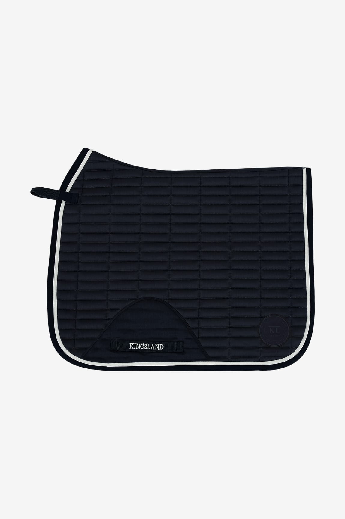 Very nice saddle pad from Kingsland's latest winter collection 2022. Girth strap attachment with extra fabric padding at the girth for extra comfort for the horse. Stylish classic quilted pattern and a very nice white piping along the edge. A Kingsland rubber logo on the left side and a logo at the front on the right side.