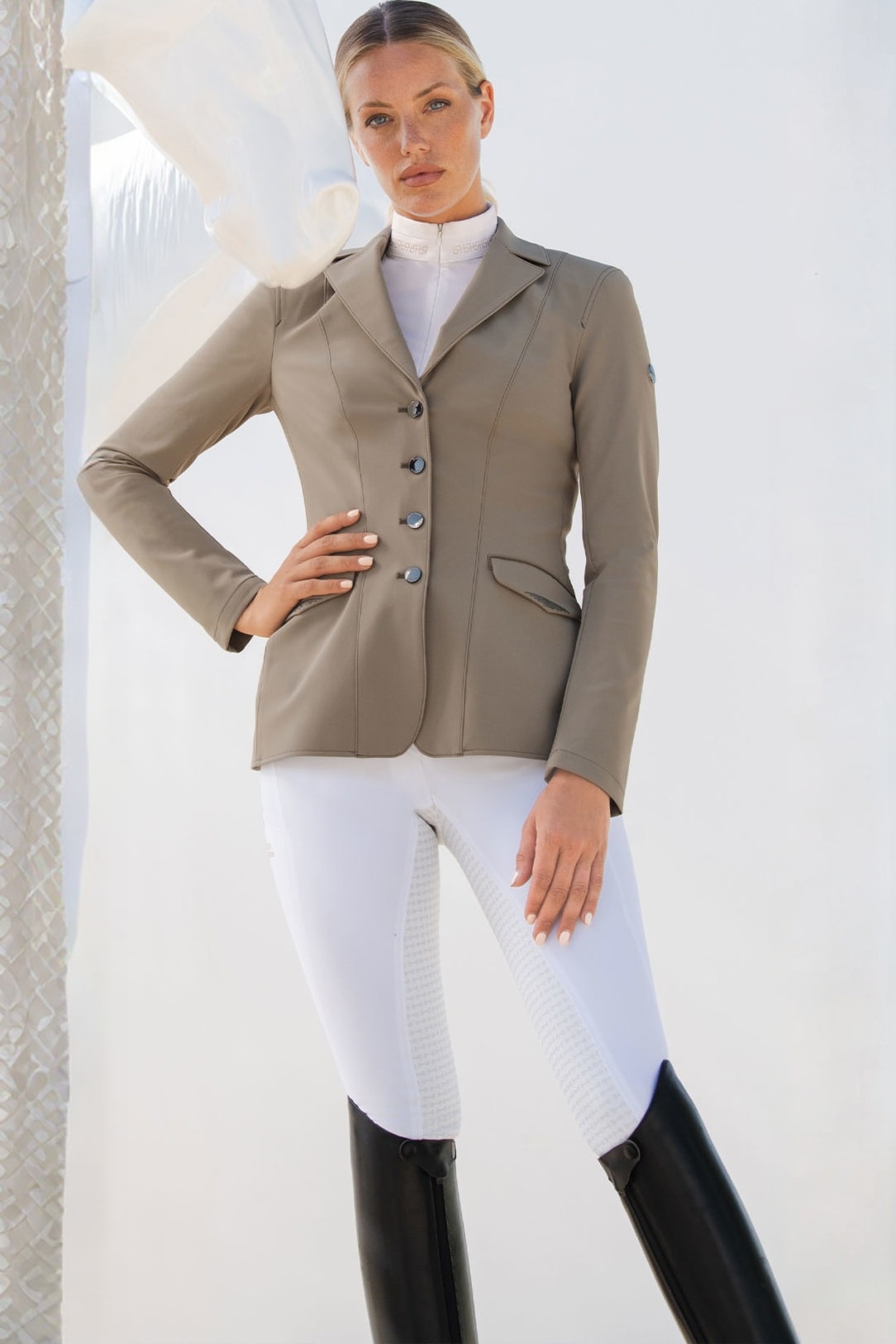 Competition jacket with sophisticated rhinestone applications that provide an elegant and luxurious look. Tailored with a feminine touch.