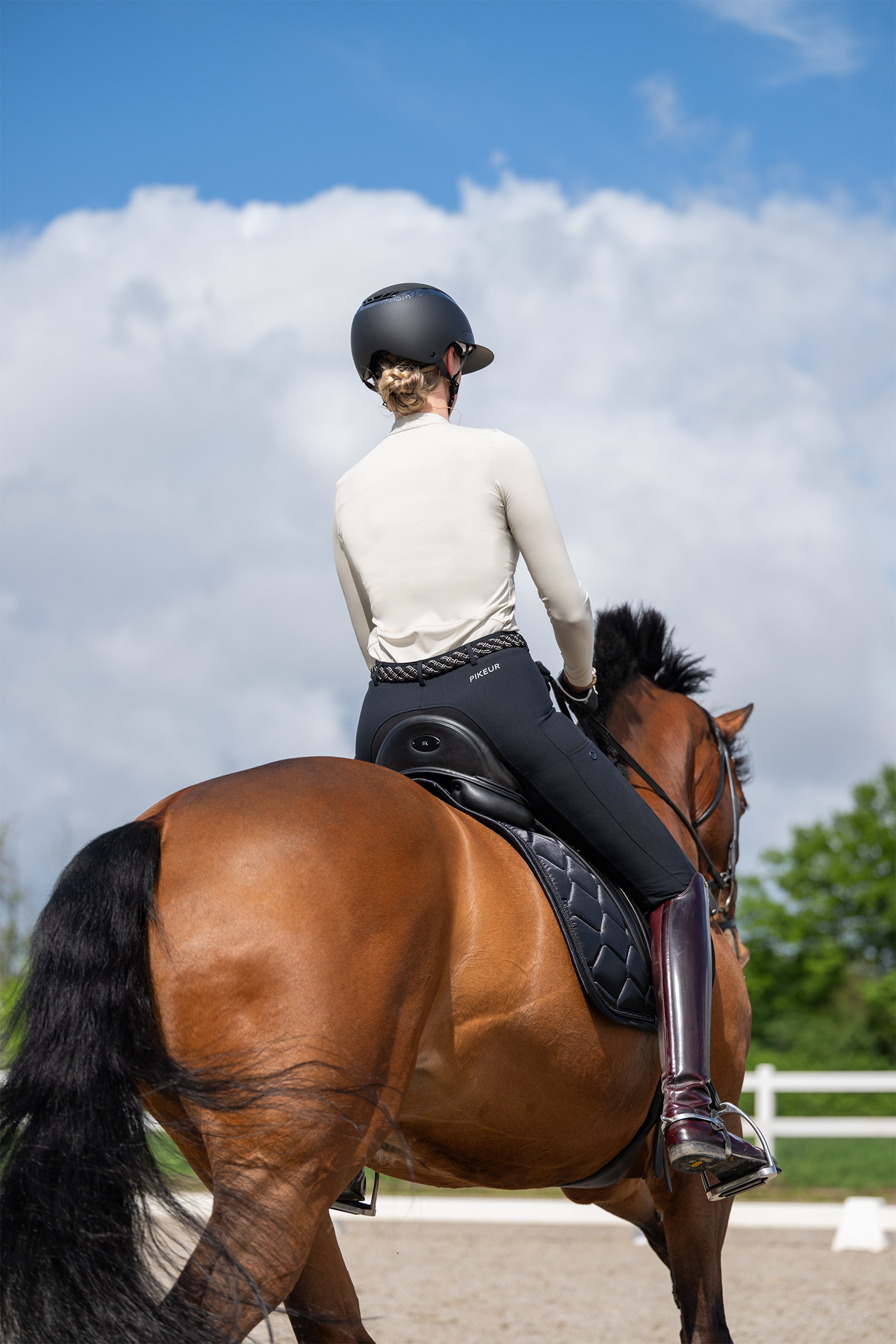 The breeches have thoughtful details such as belt loops, shiny metal accents, and Pikeur logos. They are also equipped with side stripes and a practical mobile phone pocket on the thigh.