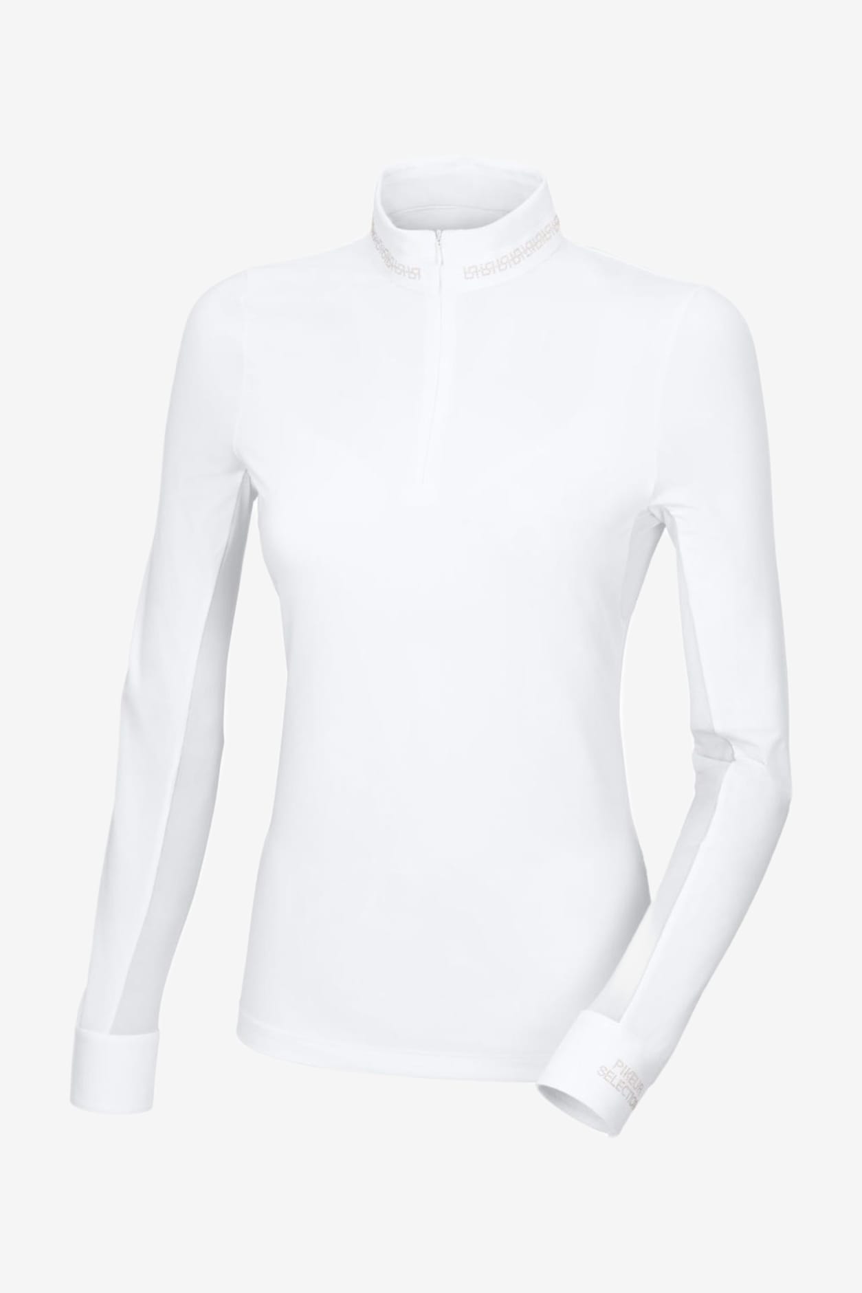 Long-sleeved competition shirt with zipper. The shirt is lightweight and highly breathable, with transparent mesh fabric under the arm. The cuffs and collar are made of soft fabric and detailed with sophisticated Pikeur Selection stones on the collar and cuffs.