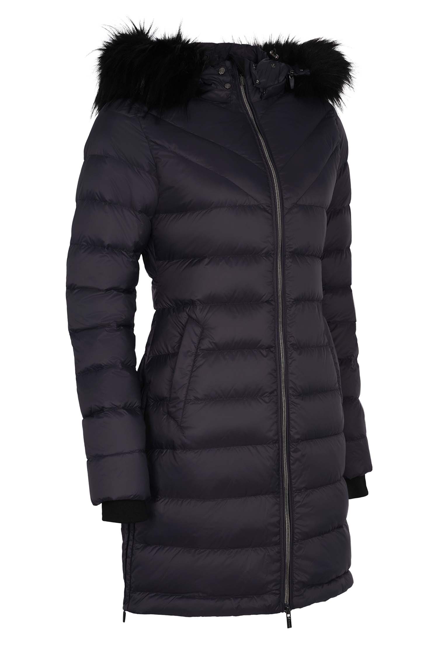 The Samshield Everest down jacket is a long feminine coat with a detachable hood and removable fur on the hood.