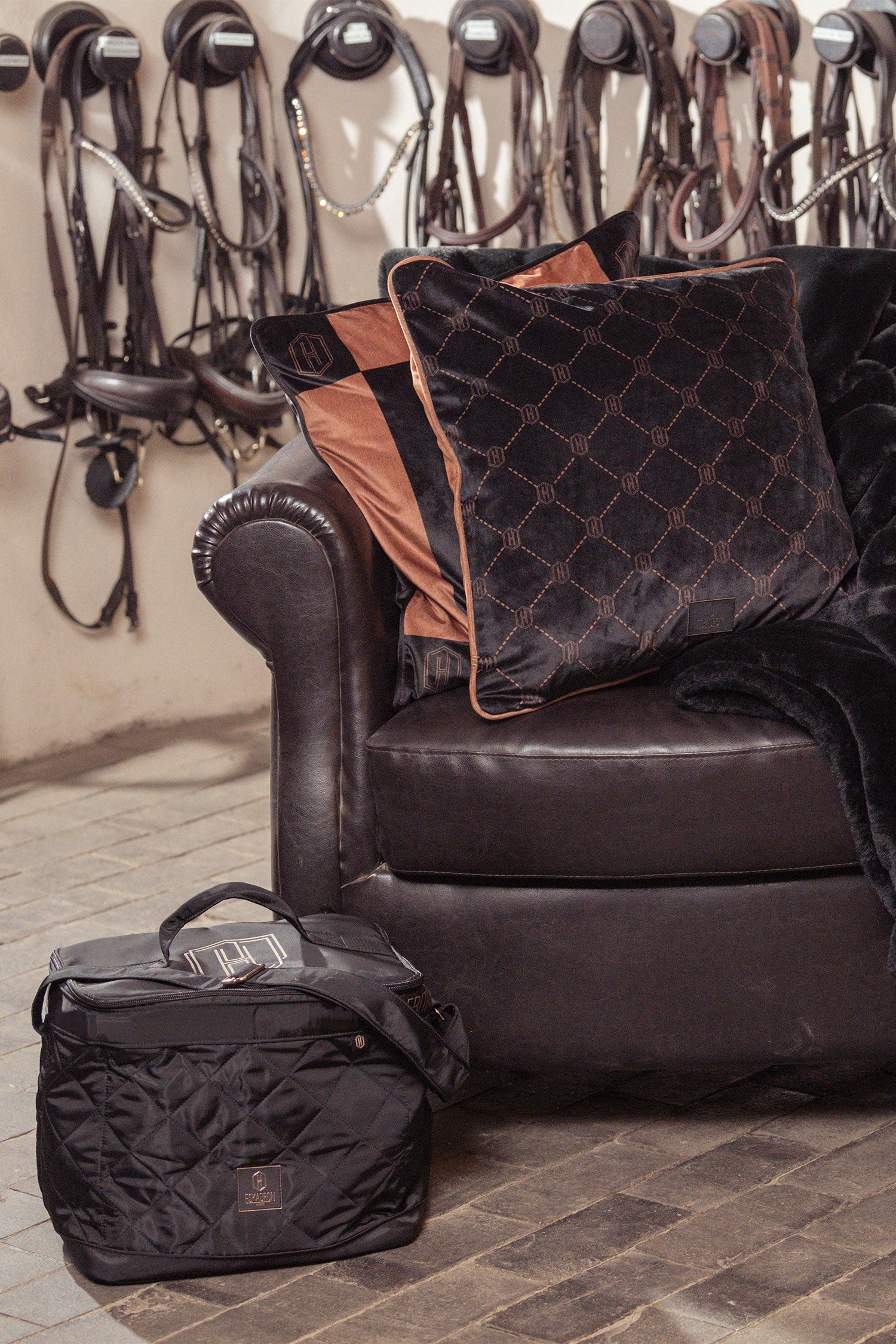 Le sac de pansage se ferme avec une fermeture éclair qui empêche les brosses ou accessoires de tomber ou la saleté de pénétrer. Bandoulière réglable et poignée pratique pour un transport facile. Un sac superbe, aussi élégant pour un usage quotidien qu'à l'écurie.