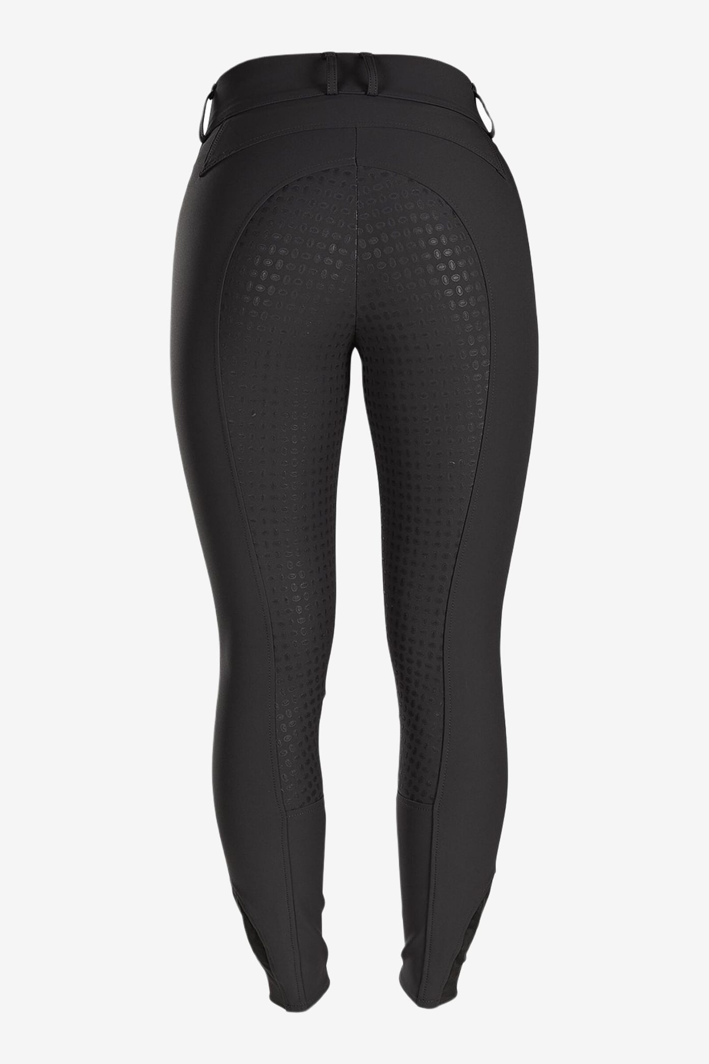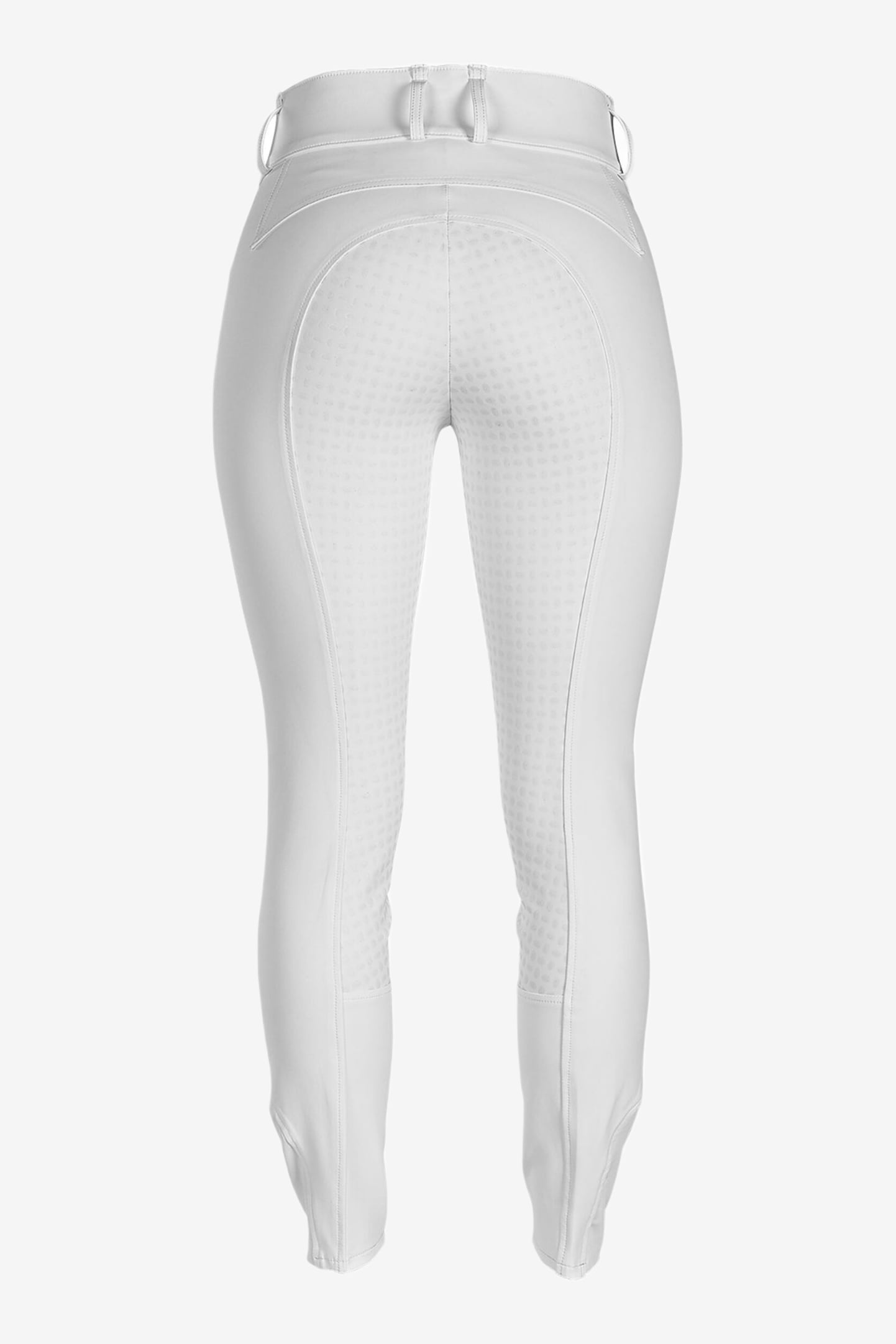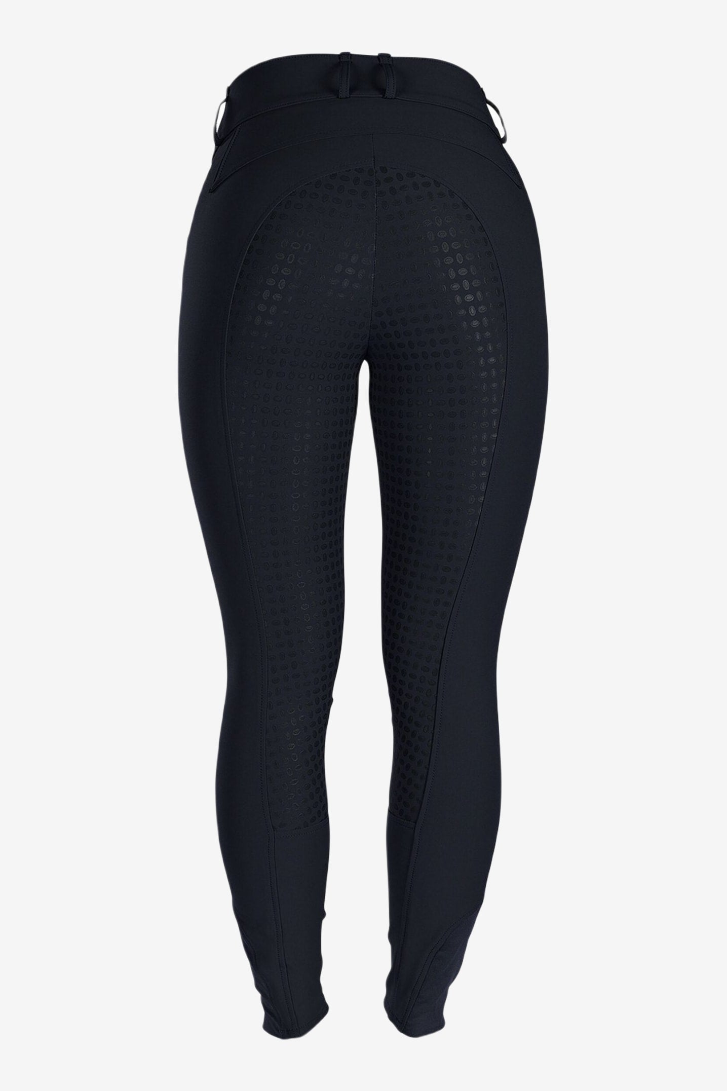 Pantalon d'équitation pour femme fabriqué en nylon/lycra Super-X, un matériau fonctionnel résistant et déperlant. Très résistant à l'usure avec une élasticité dans quatre directions. Fond intégral en silicone. Taille haute confortable avec large ceinture et poches avant en biais. Trois boutons à l'avant qui donnent du caractère à la taille haute. Coupe élégante à l'arrière pour une belle silhouette. Bas de jambe en lycra.