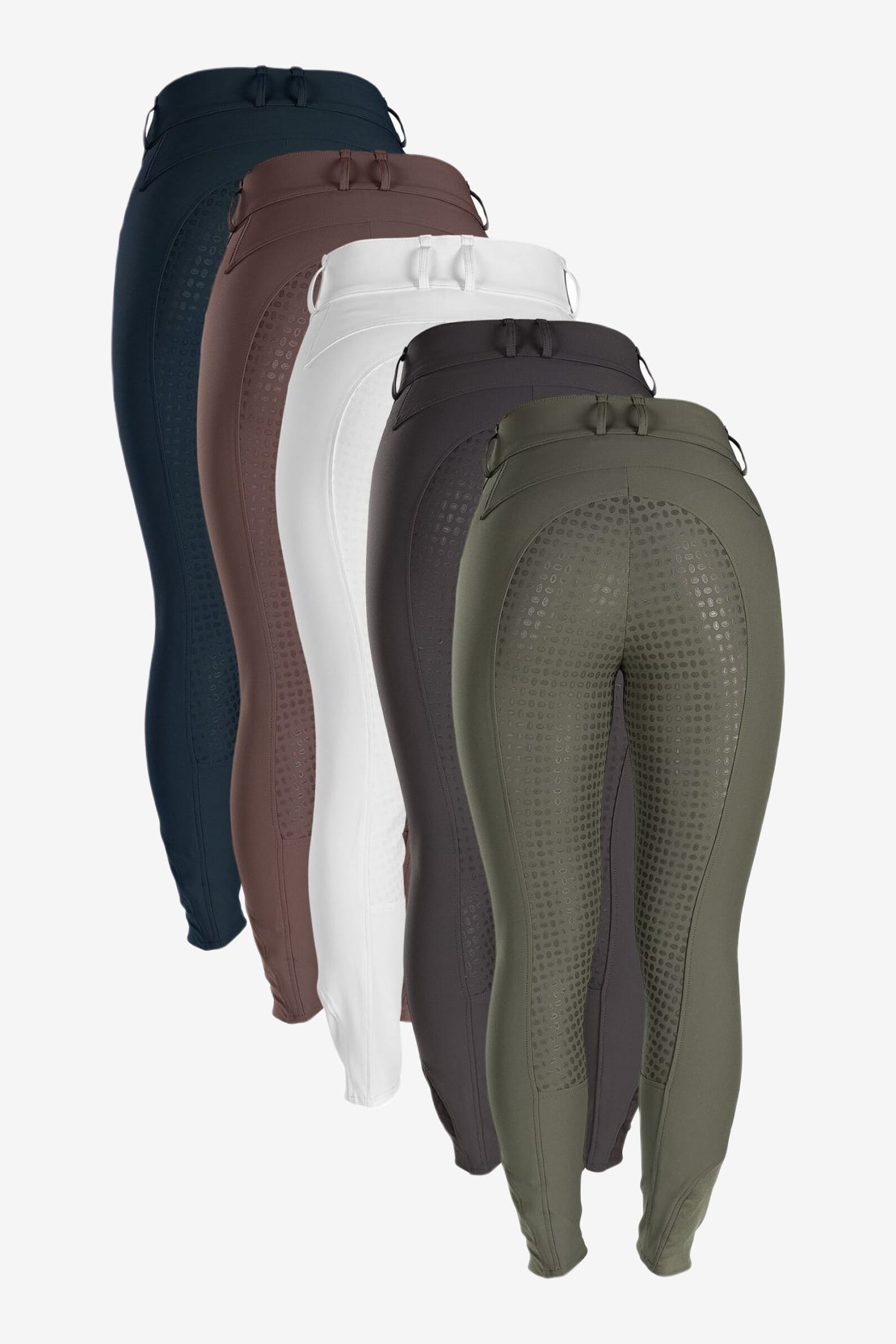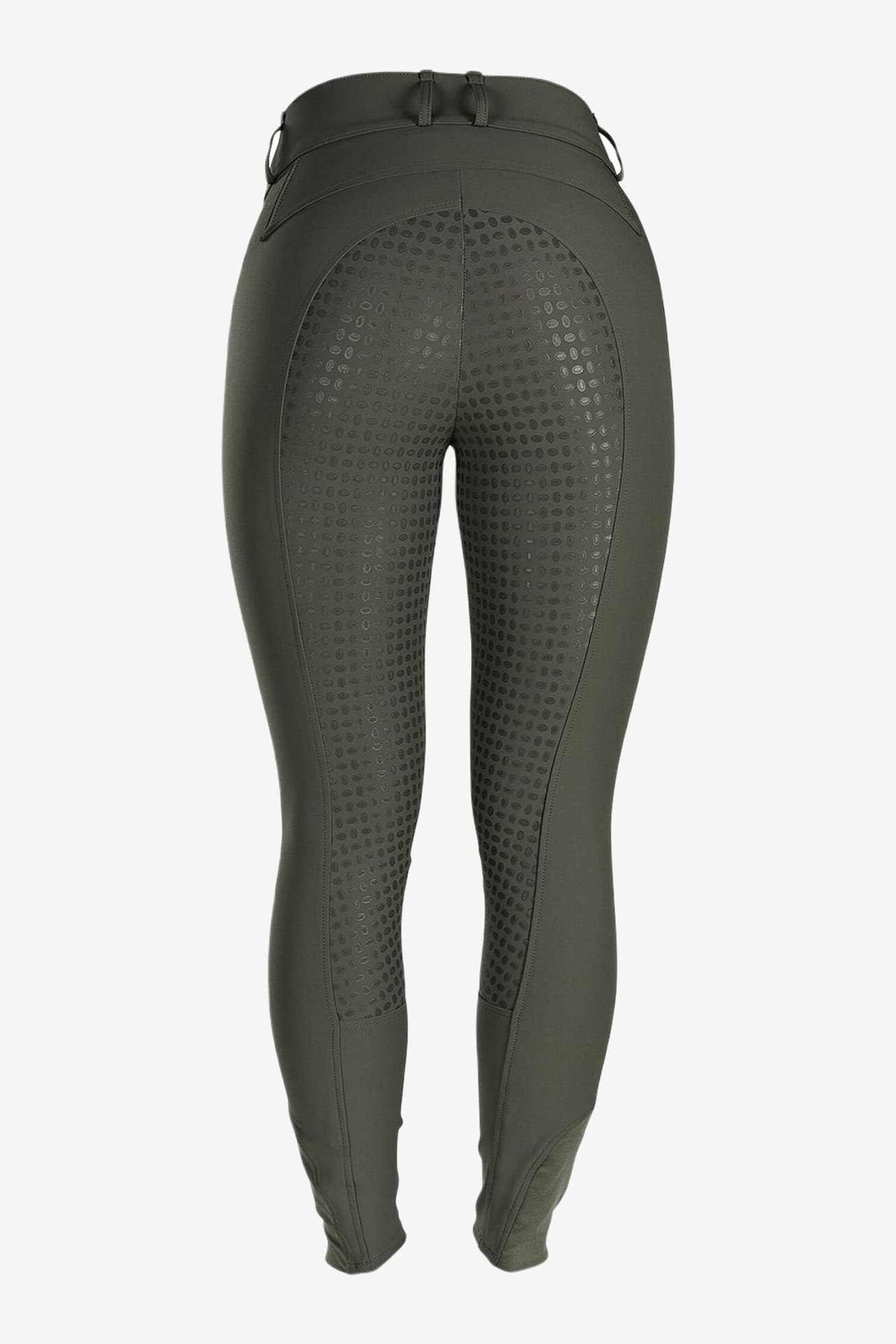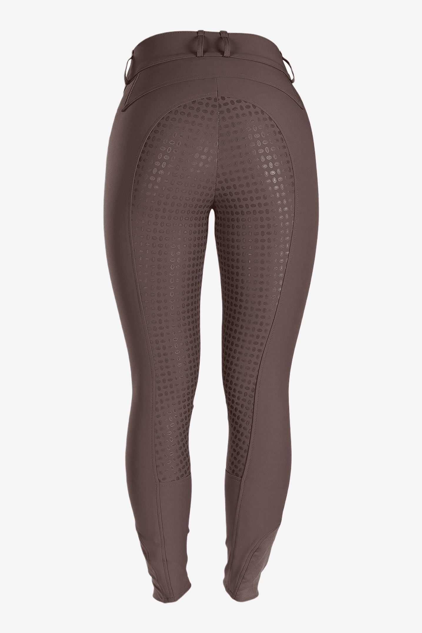 Pantalon d'équitation pour femme fabriqué en nylon/lycra Super-X, un matériau fonctionnel résistant et déperlant. Très résistant à l'usure avec une élasticité dans quatre directions. Fond intégral en silicone. Taille haute confortable avec large ceinture et poches avant en biais. Trois boutons à l'avant qui donnent du caractère à la taille haute. Coupe élégante à l'arrière pour une belle silhouette. Bas de jambe en lycra.