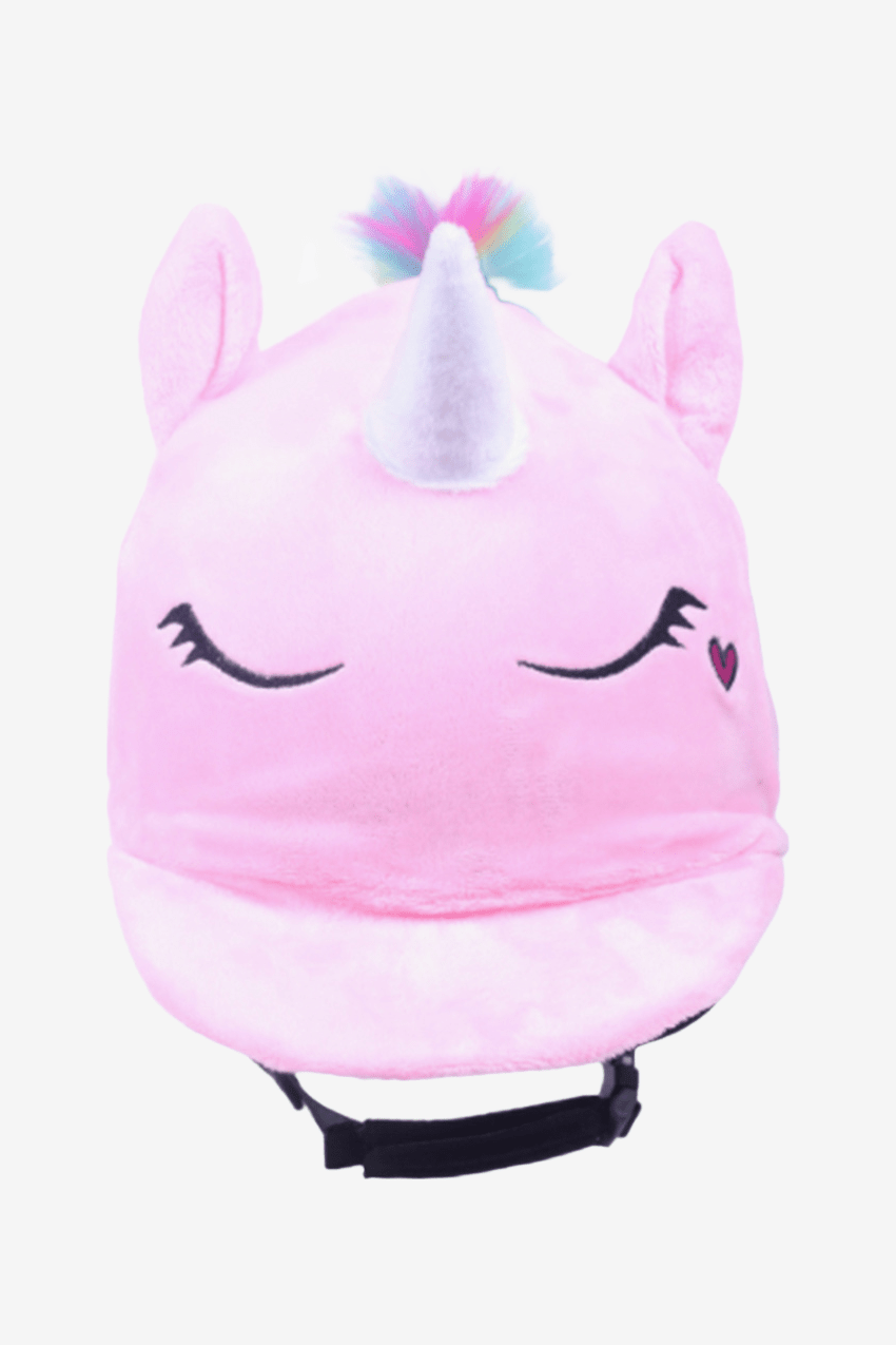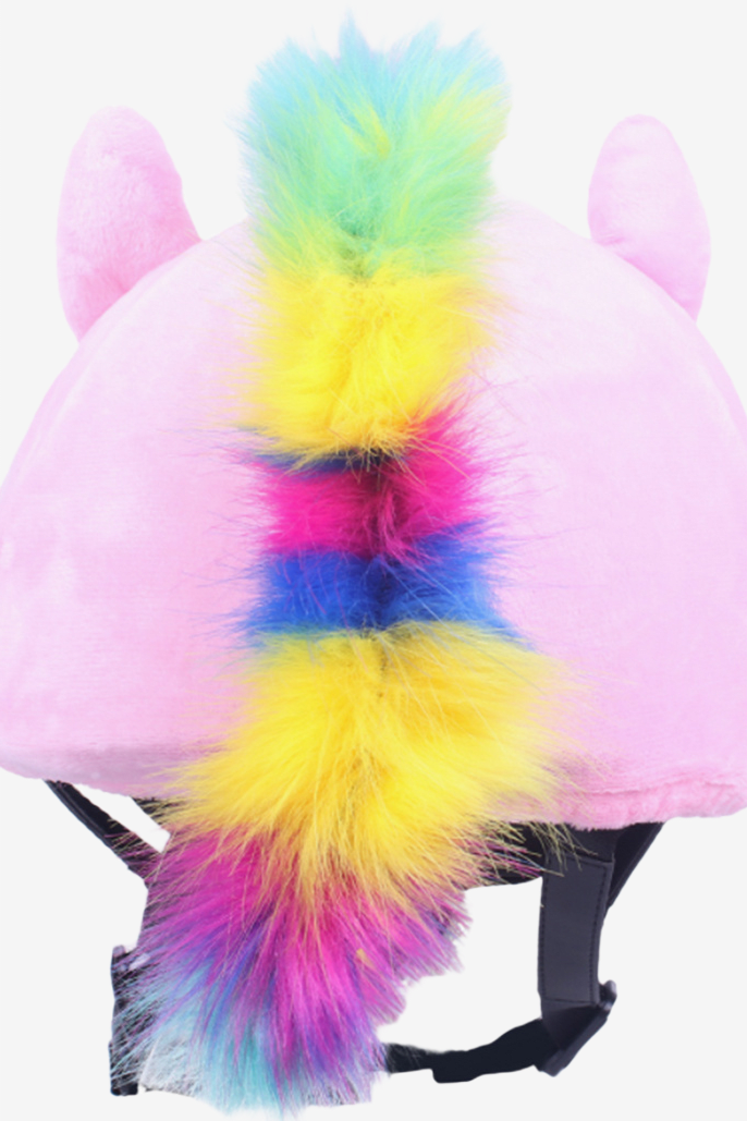 Couvre-casque en polaire doux avec oreilles 3D, corne et crinière colorée. Facile à enfiler sur le casque grâce à l'élastique.