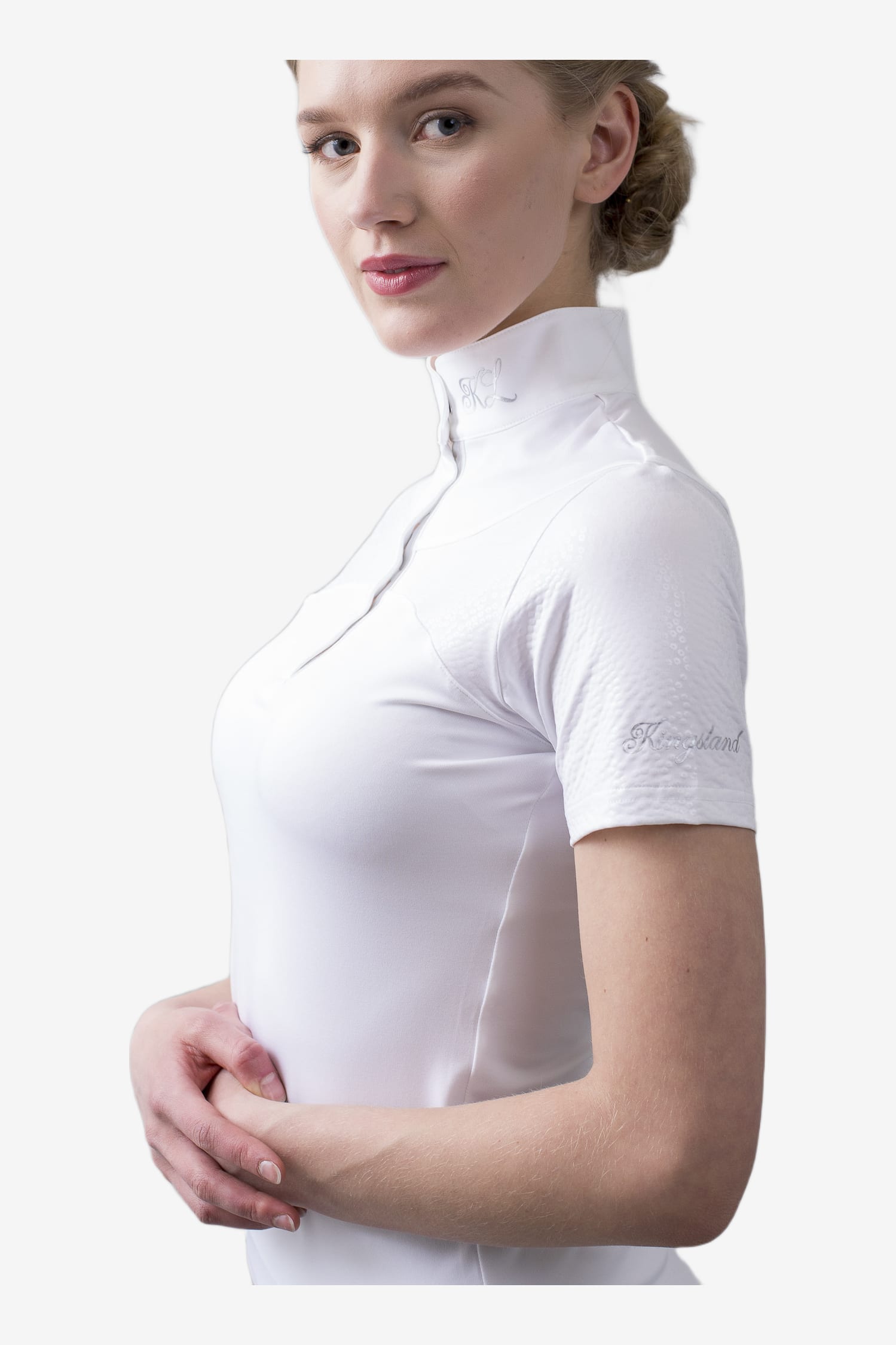 Kingsland designteam har överträffat sig själva genom att kombinera funktionaliteten hos snabbtorkande och andningsbart tyg med vackra designegenskaper. Dessa inkluderar paljettliknande tryckdetaljer på ärmarna, oket fram/bak och knappslå på denna fantastiska tävlingsskjorta.