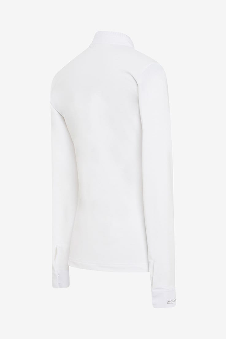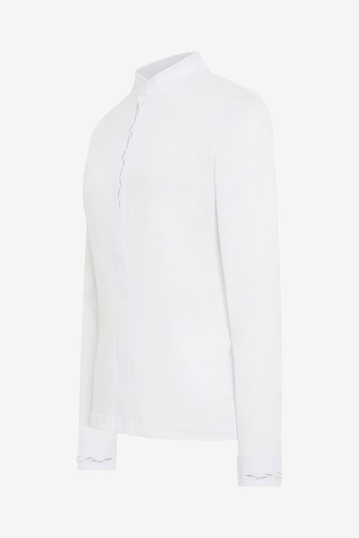 La chemise de concours Juliette Crystal Flower incarne l'élégance féminine délicate, avec des cristaux Swarovski® appliqués à la main et des broderies décoratives ornant la patte de boutonnage zippée dissimulée et les poignets. Le tissu italien est une matière technique très extensible et respirante qui évacue la transpiration pour garder la cavalière au sec et à l'aise. La protection UV préserve la qualité du tissu et protège la peau de la cavalière contre l'exposition au soleil.