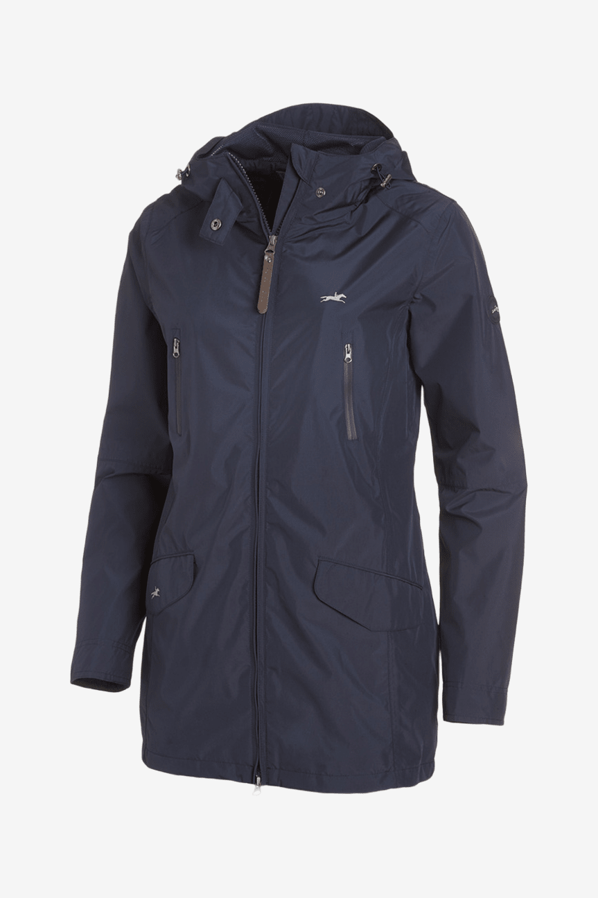 Sportig damjacka i längre modell som är både vattentät och andas väl. Tejpade sömmar med en justerbar huva. Fyra fickor på framsidan, i brösthöjd två stycken som stängs med dragkedja, i midjehöjd två stycken med lock. Perfekt för det lite mer karga klimatet. Justerbar även i midjan och den har en två-vägs dragkedja framtill vilket gör den bekväm även i sadeln. Reflexdetaljer så att du syns i mörkret.