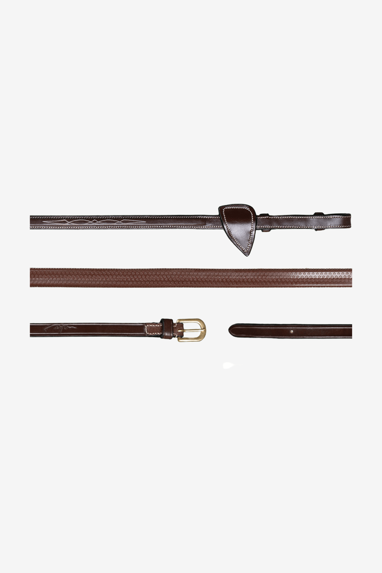 Gummitygel i fint spanskt läder med inåtvänt spänne. Vit mönstersöm för extra stil, mässingspänne för hållbarhet och eleganta martingalstoppar för en snygg look.