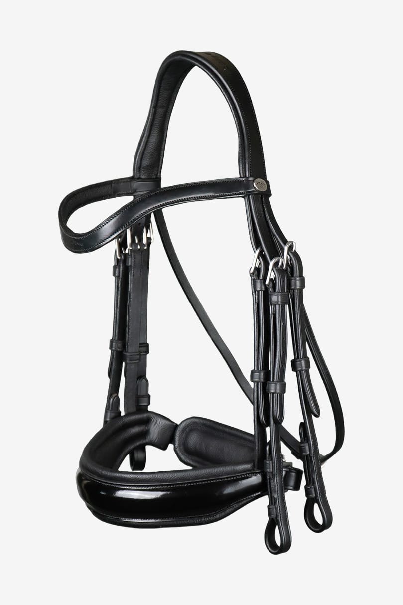 Elegante kandare, Working Collection van Dyón, met een brede gelakte neusriem van buffelleer. Mooi gebogen frontriem met het Dyón-logo.