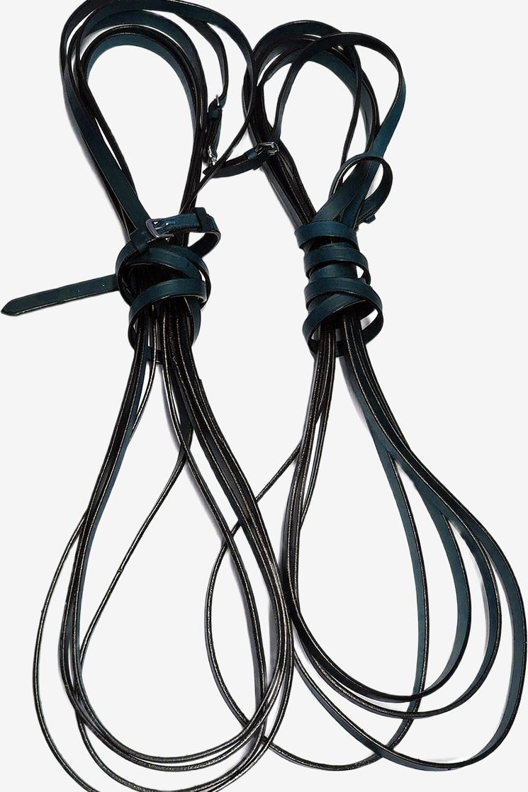 Leren teugels voor het lange lijnen van paarden.