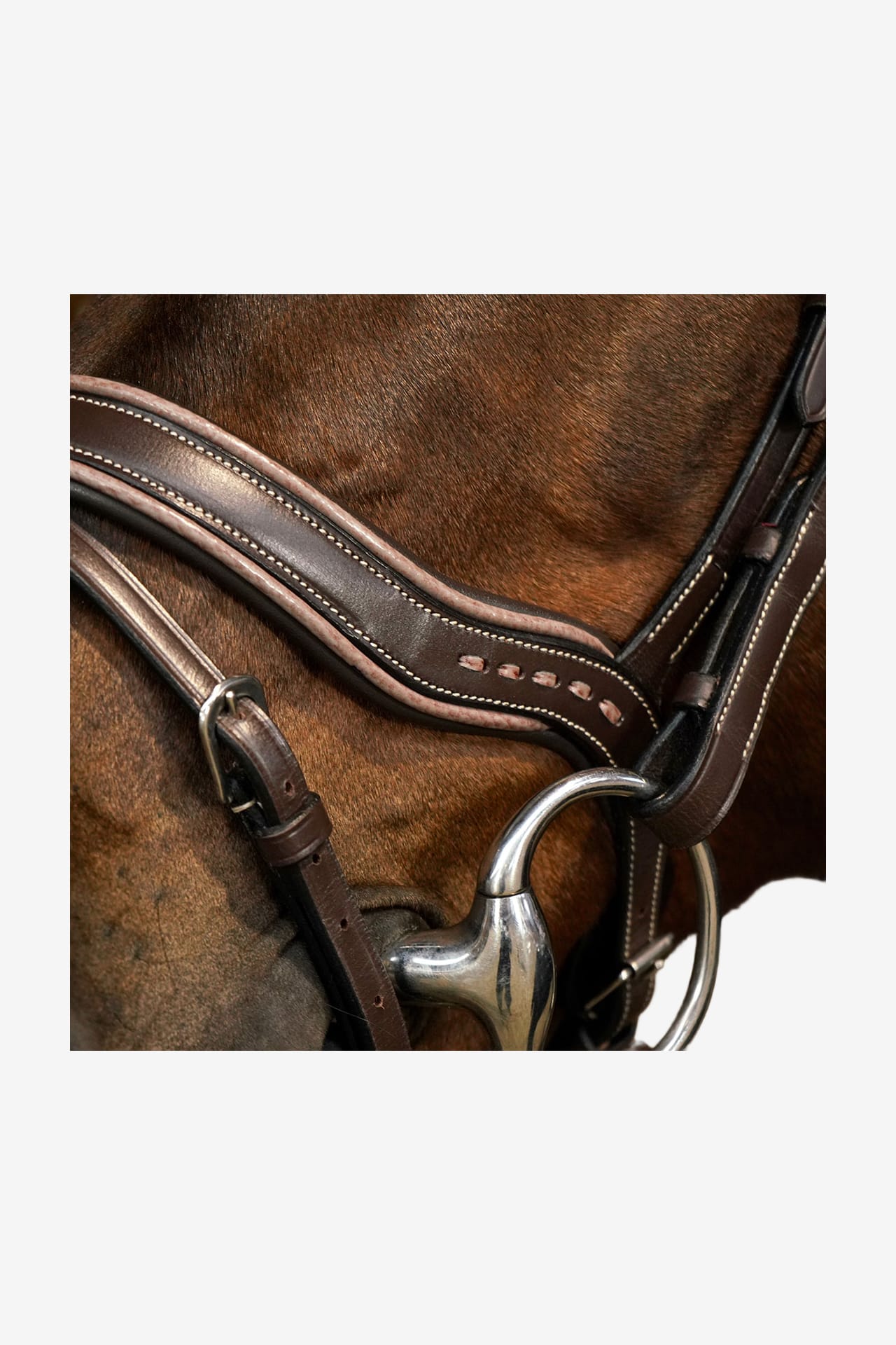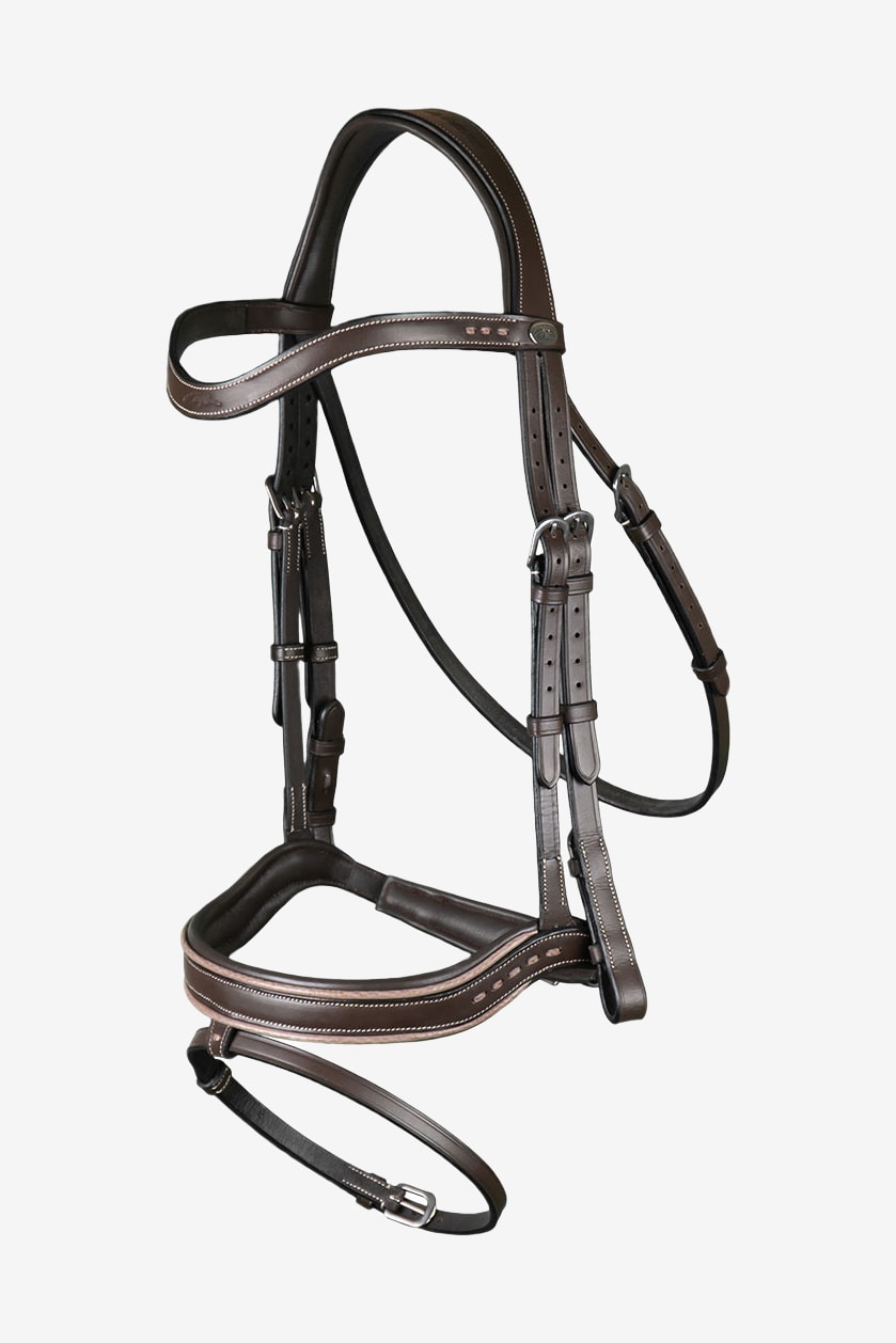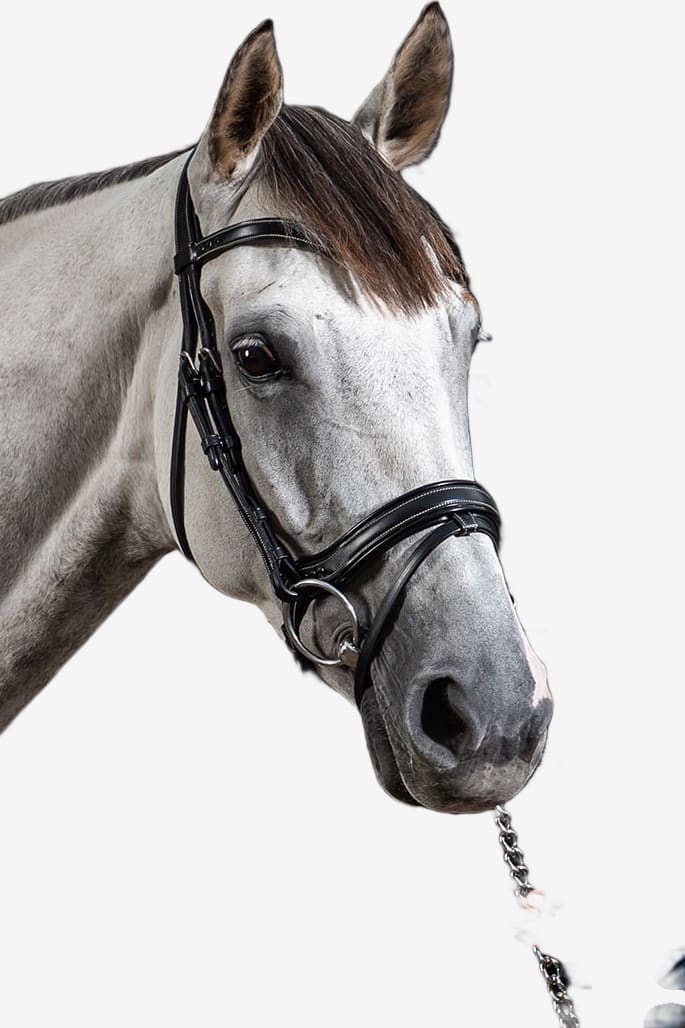 Innovatief en praktisch hoofdstel van Dyón. Het hoofdstel is gemaakt van buffelleer en heeft zilverkleurige gespen.