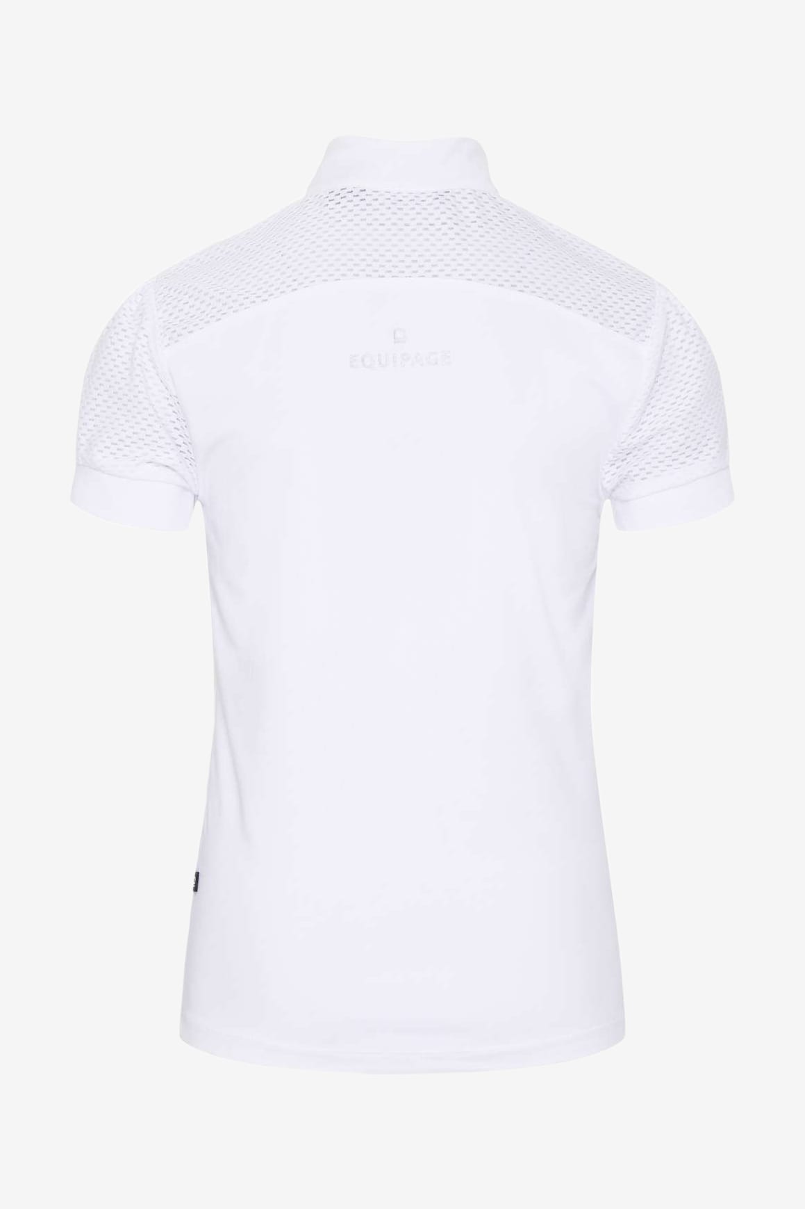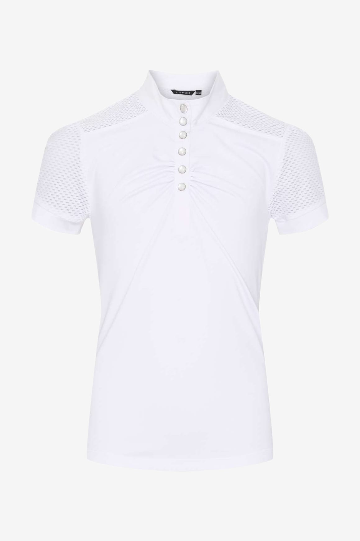 Superfin tävlingsskjorta från Equipage med korta ärmar. Toppen har en hög krage och tryckknappar som skimrar i pärlemor. Toppen är detaljerad med rynkat bröst och har fina puffärmar. Meshpartier över axlar och ärmar ger en god ventilering och håller dig sval.