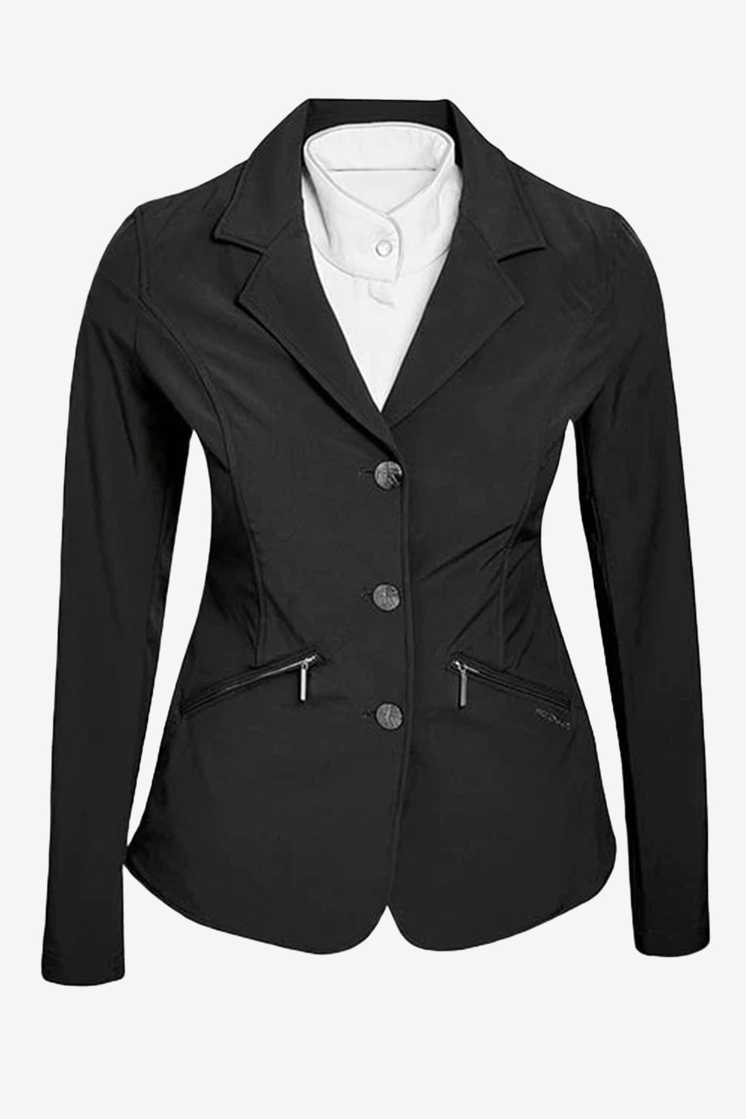 Stijlvol en elegant jasje in kindermaat van dun softshellmateriaal. Waterdicht oppervlak dat regen van het lichaam weghoudt. Lichtgewicht en rekbaar wedstrijdjasje dat soepel met het lichaam meebeweegt en de ruiter vrij laat bewegen. Ritsen op de zakken en knopen aan de voorkant. Machinewasbaar (binnenstebuiten wassen).