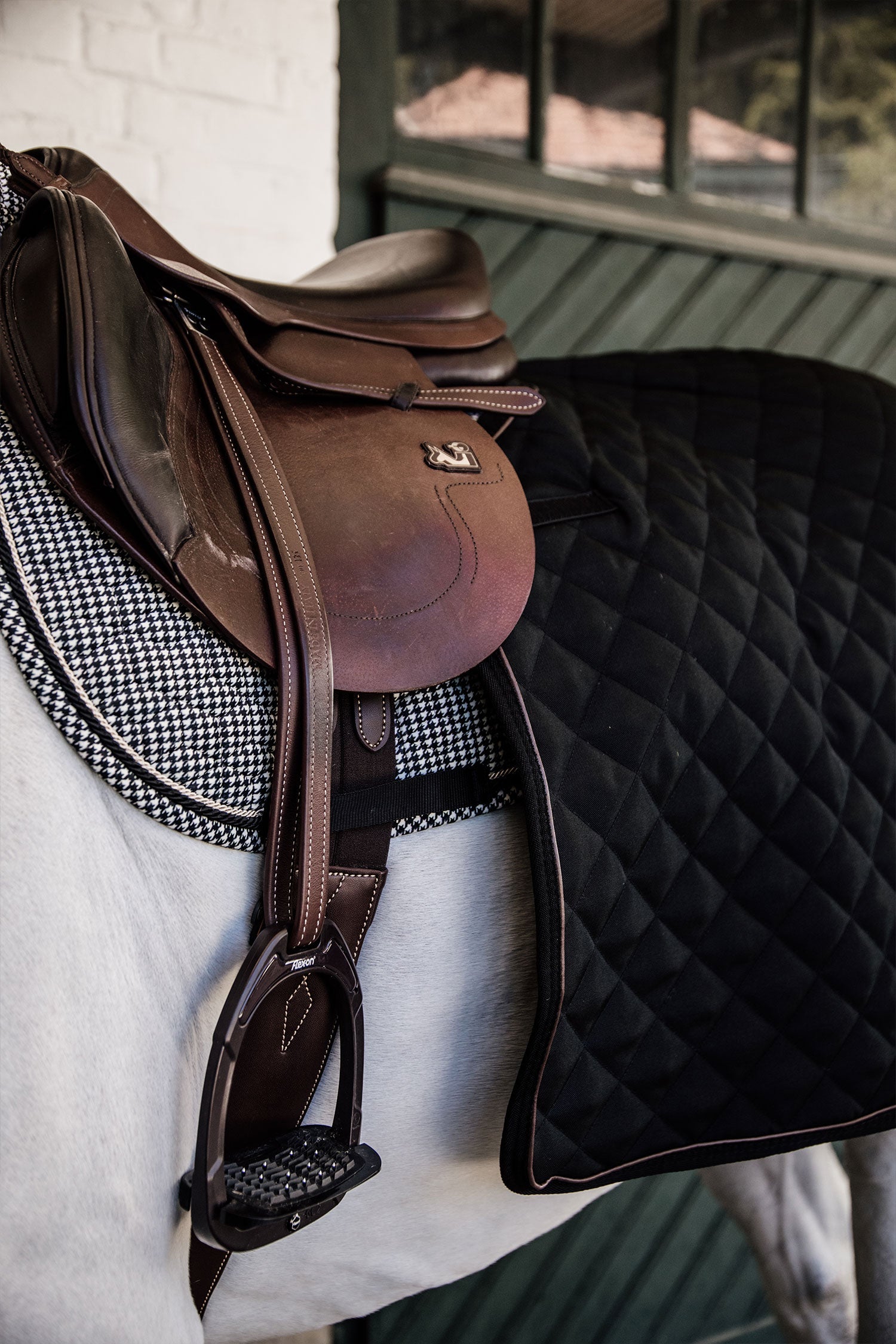 De uitrijdeken heeft klittenbandsluitingen die aan de singelstoten worden bevestigd, evenals een bilkoord.