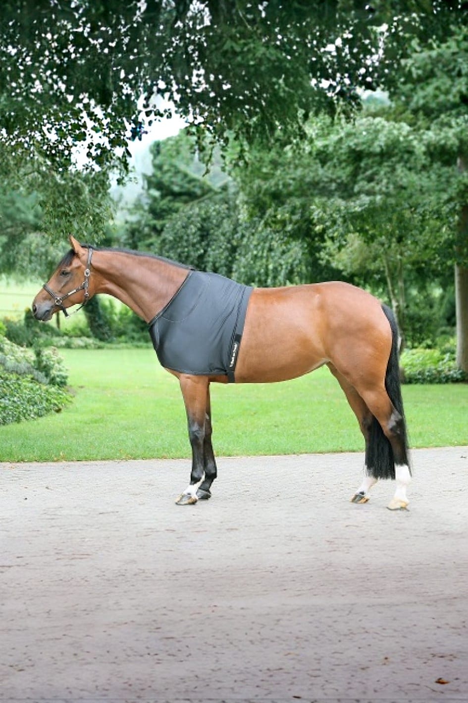 Ochraniacz na łopatki Back On Track, który stymuluje sztywne mięśnie i stawy, jednocześnie chroniąc przed otarciami i niepotrzebnym naciskiem na łopatki konia pod innymi derkami.