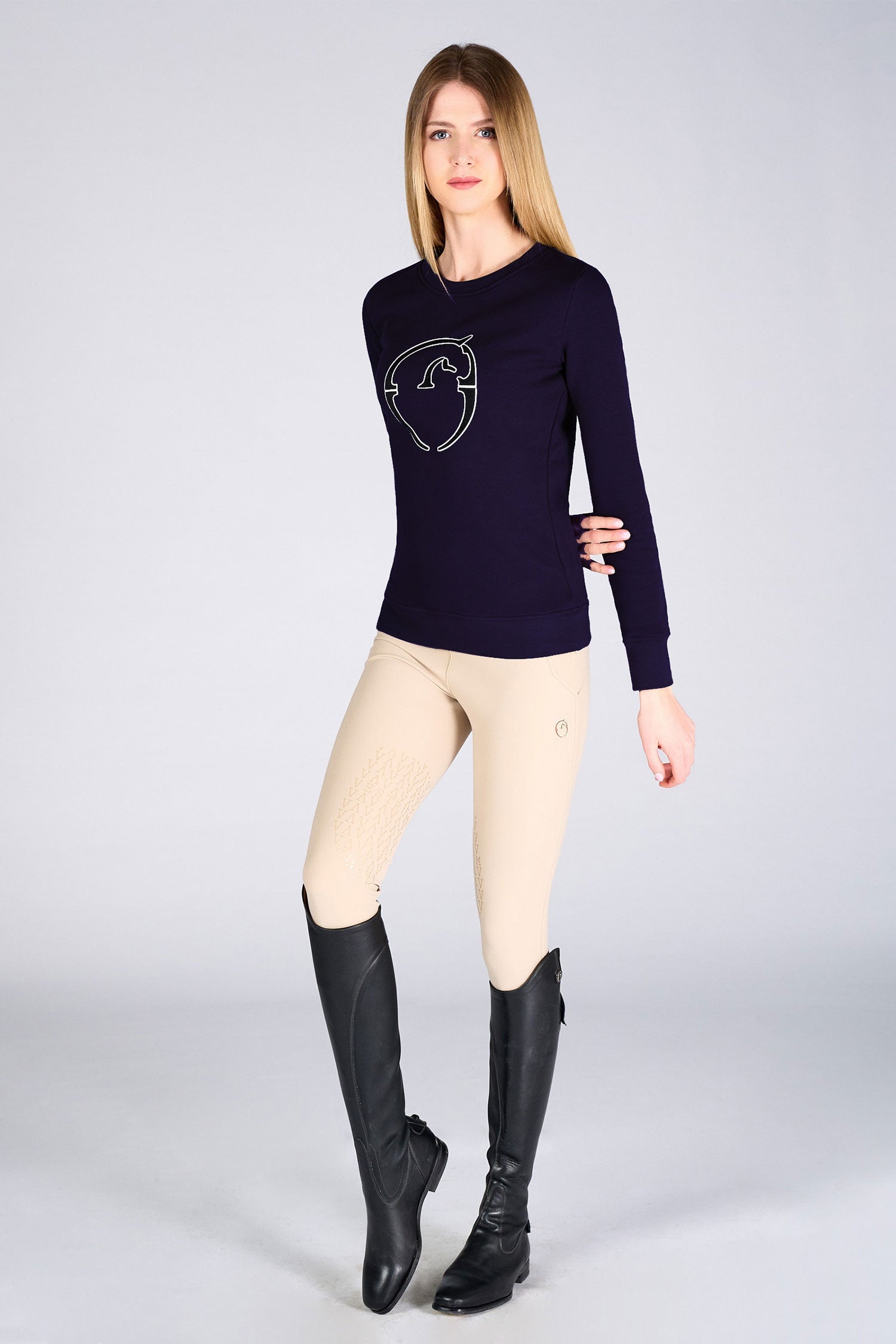 Fin tjocktröja från Italienska Vestrum. En tröja som är lite fleece fodrad med Vestrums vackra logotyp i svart på framsidan. Tesido är en klassisk sweater som är återkommande varje ny kollektion. Passar lika bra till ridbyxor som till vardags. Lätt figursydd med en klassisk cut som ger en fin silhuett.