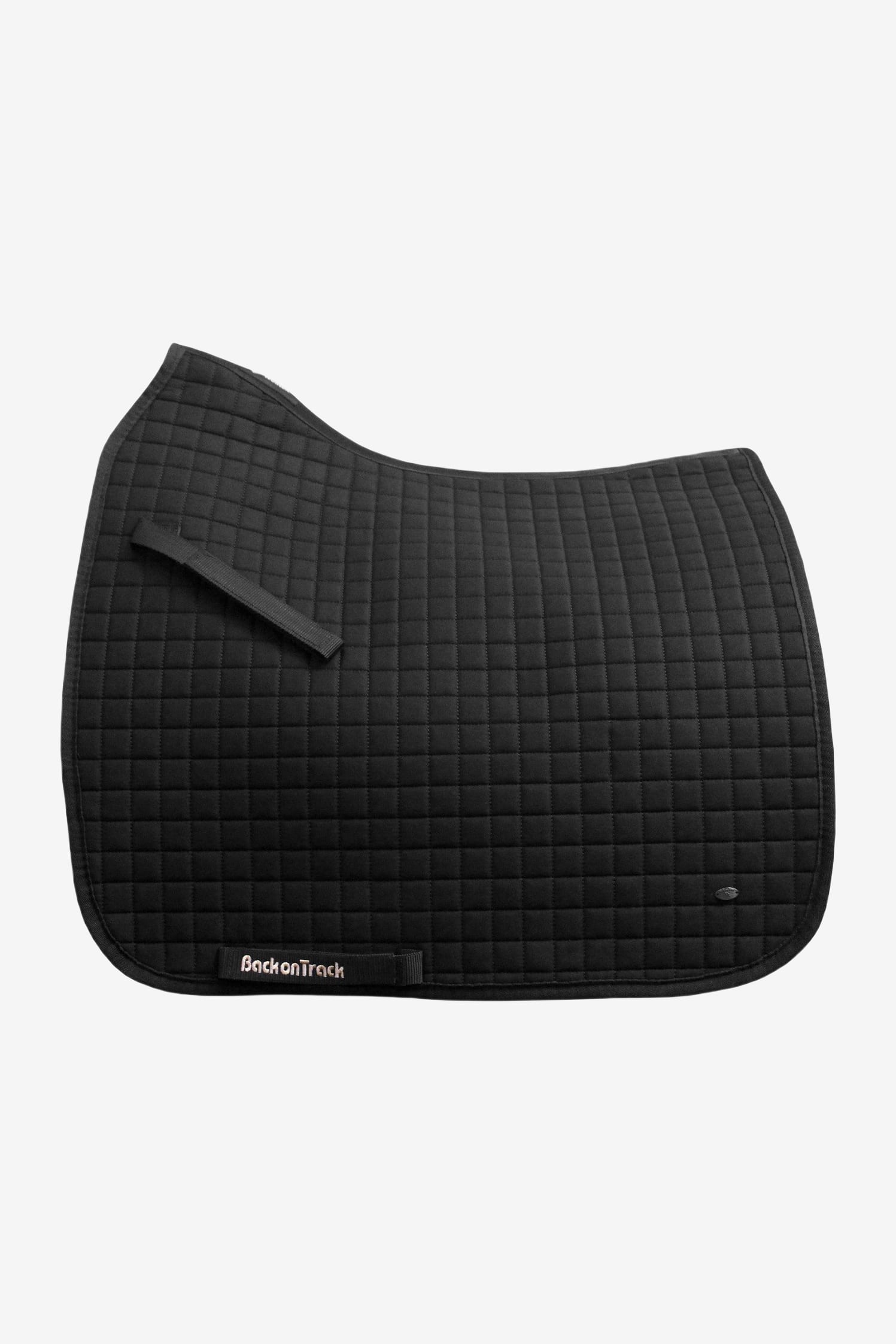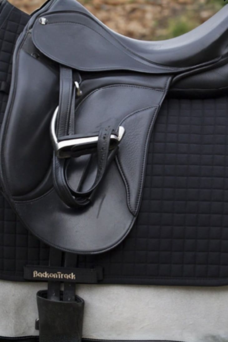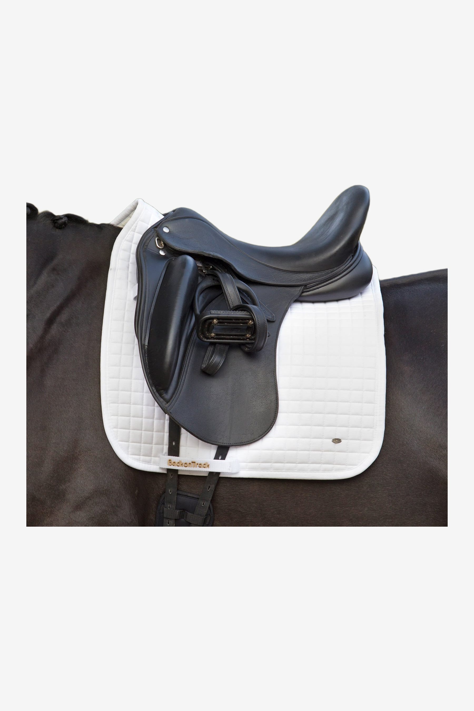 Schabraket är med ett litet metallemblem på sidan, samt Back on Track-logo på remmen för sadelgjorden.