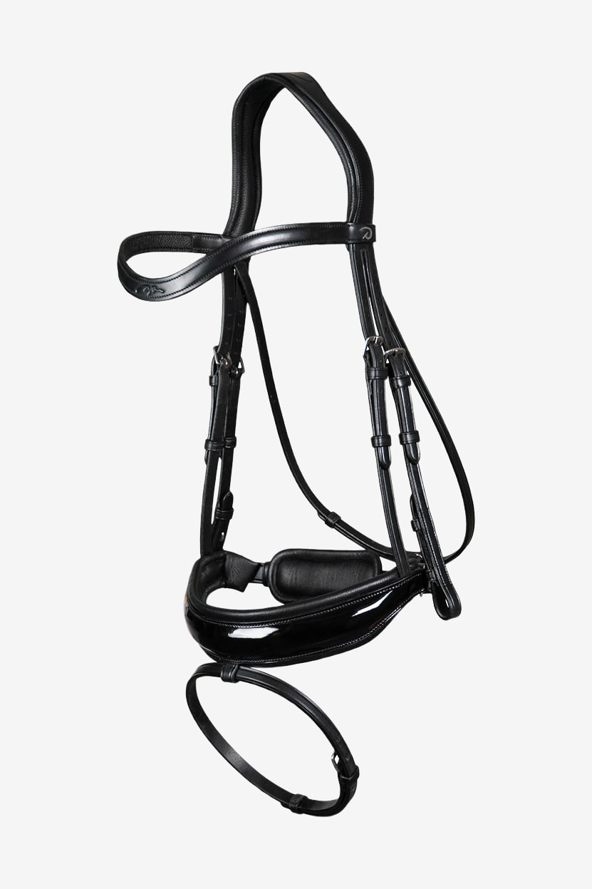 Eleganckie ogłowie ujeżdżeniowe z nachrapnikiem pullback wykonane z hiszpańskiej skóry i klamrami skierowanymi do wewnątrz.