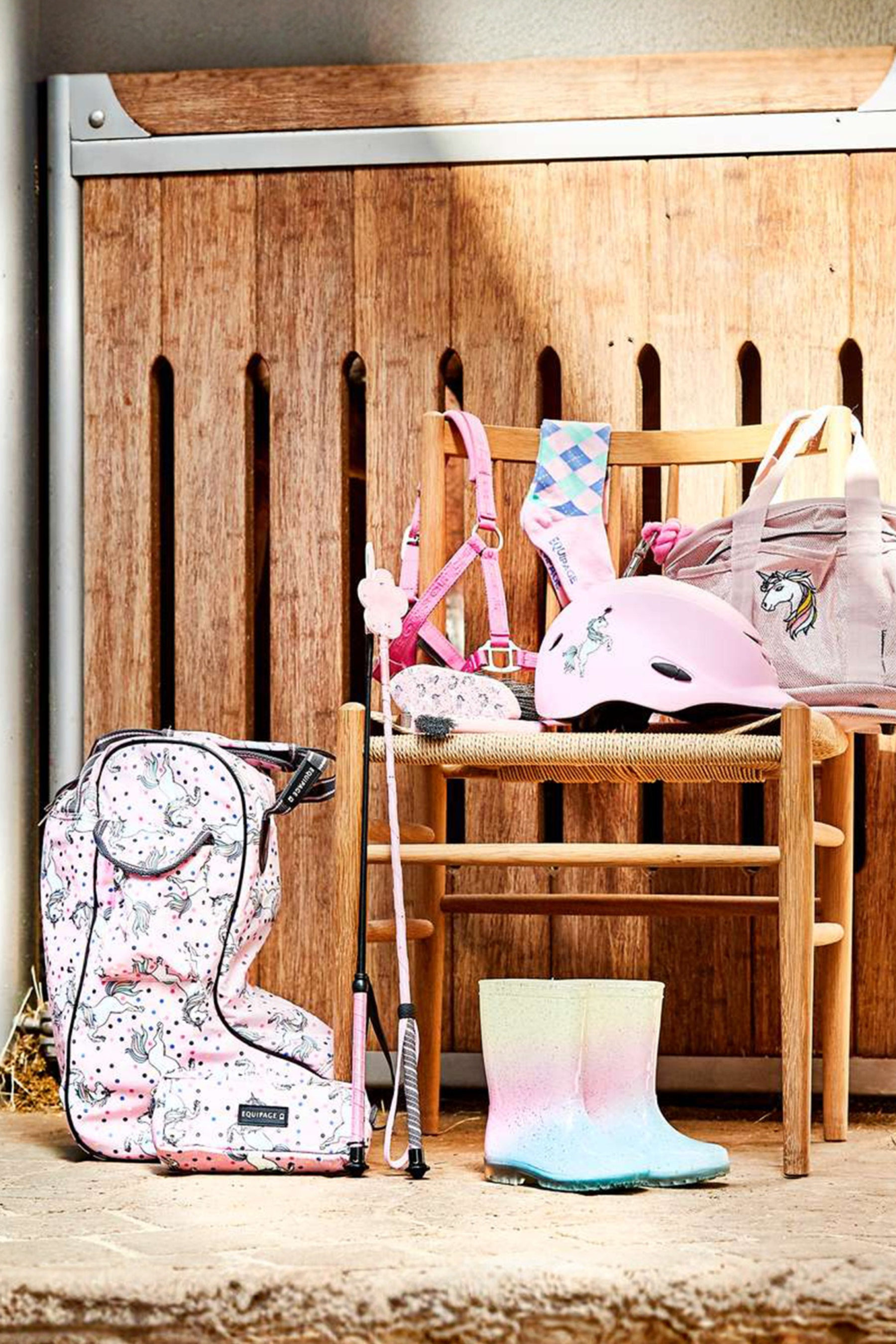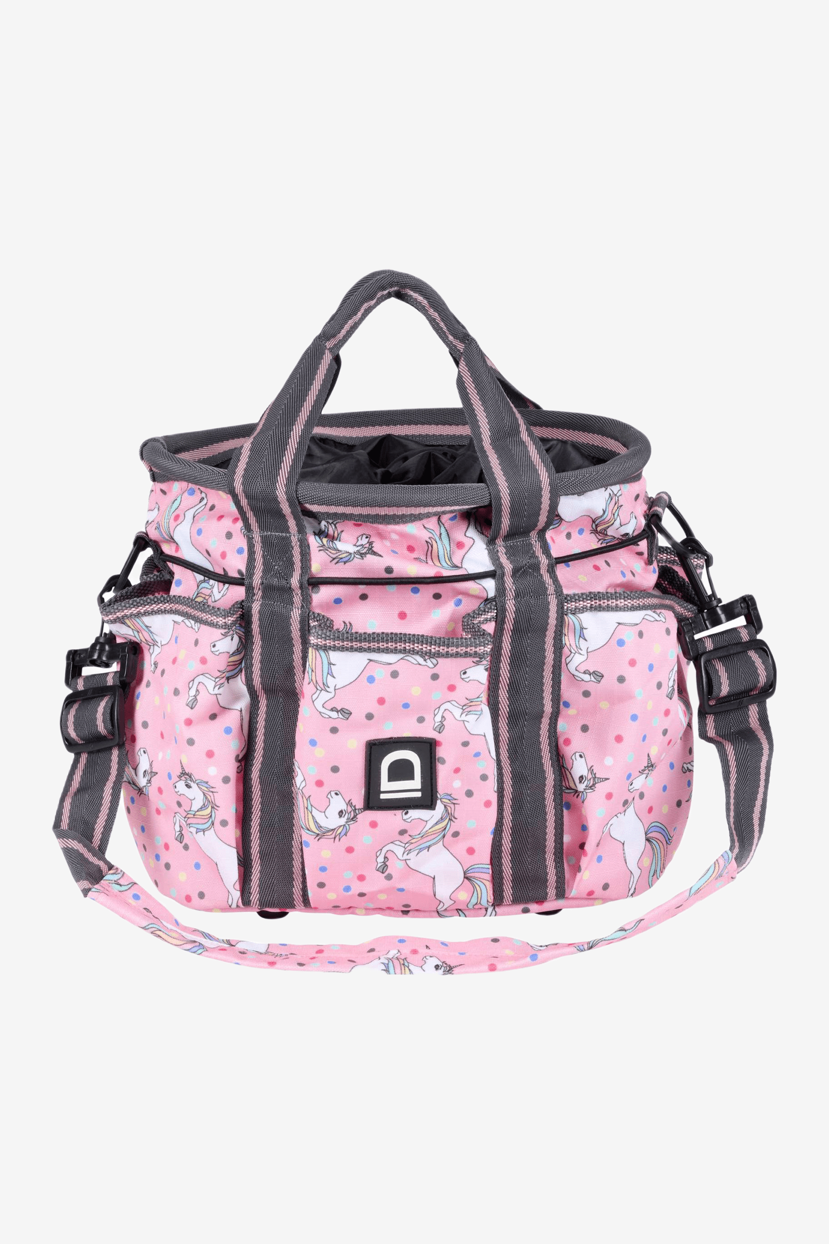Praktyczna torba na szczotki marki Equipage z dużą ilością miejsca do przechowywania i sześcioma kieszeniami po bokach. Pasek na ramię oraz dwa uchwyty ułatwiające transport. Motyw jednorożca i logo Equipage z boku. Cztery nóżki i usztywnione dno zapewniają stabilność. Idealnie pasuje do torby na oficerki Jasmin oraz torby na kask Juno.