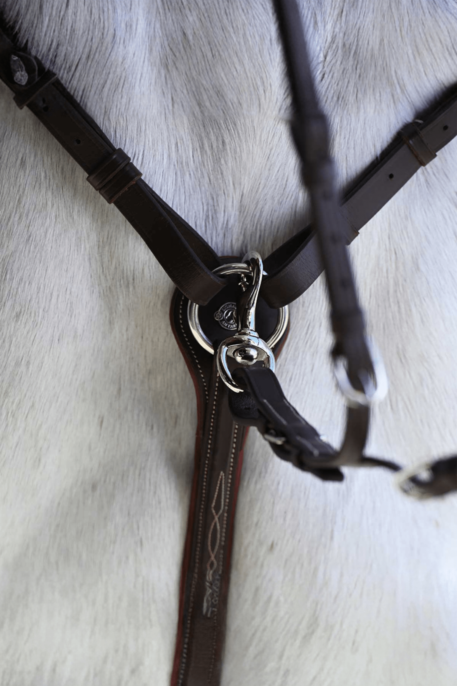 En klassisk förbygel i högkvalitativt läder från serien Signature by Antarés. Smarta spännen i rostfritt stål att fästa i sadelns D-ringar och en avtagbar brygga över manken för ökad stabilitet. Lädret längs hästens bog har en snygg brodyr och brunt resår för ökad följsamhet. Fäste för martingaldel framtill. OBS säljs utan martingaldel, denna köps till separat.