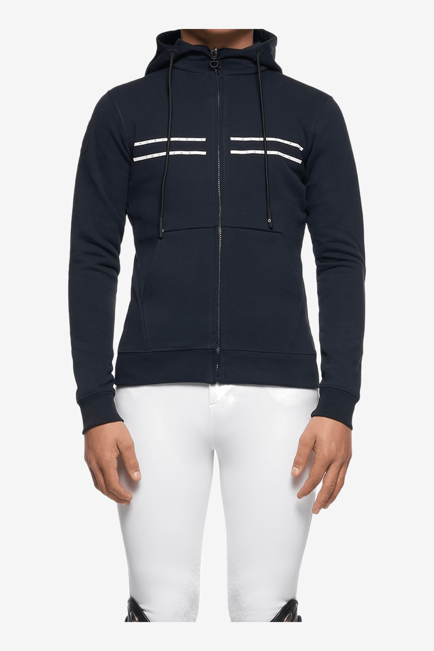 Ribbstickade muddar vid ärmarna och nertill på plagget och en bekväm huva. Dragkedja framtill tillsammans med två framfickor.