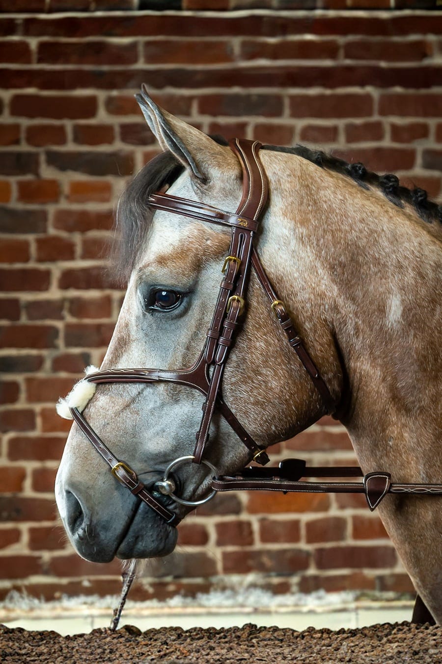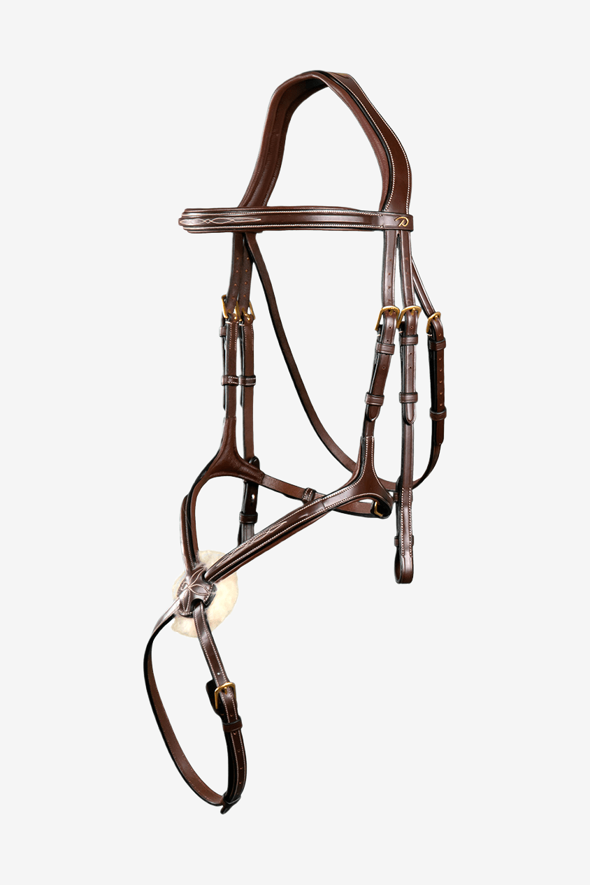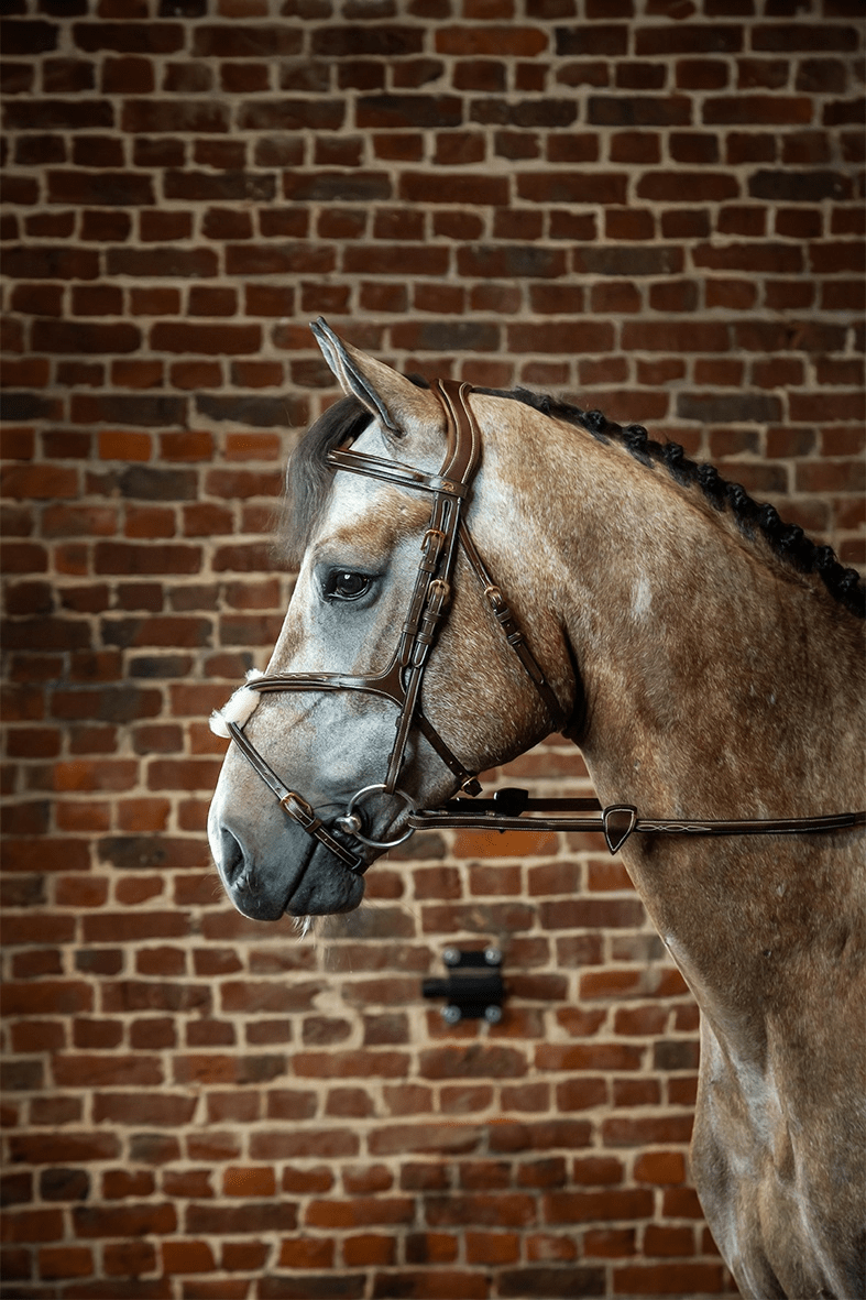 Träns Mexikansk Nosgrimma från Dyón Collection. Dyón har alltid haft fantastiska träns och nu har de kommit med ännu mer fantastiska nyheter. Nackstycket är smalare och mer anpassat efter hästens alla känsliga punkter på huvudet. Ett träns gjort på mjukt läder från Spanien med spännen i mässing samt fina vita mönstrade sömmar.