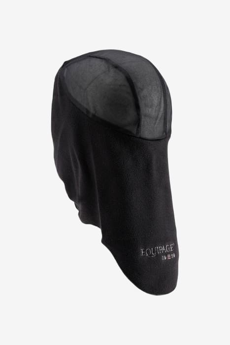Mjuk fleecehuva från Equipage som enkelt träs på huvudet och bygger minimalt under ridhjälmen, vilket gör att storleken och ridhjälmens passform inte påverkas.