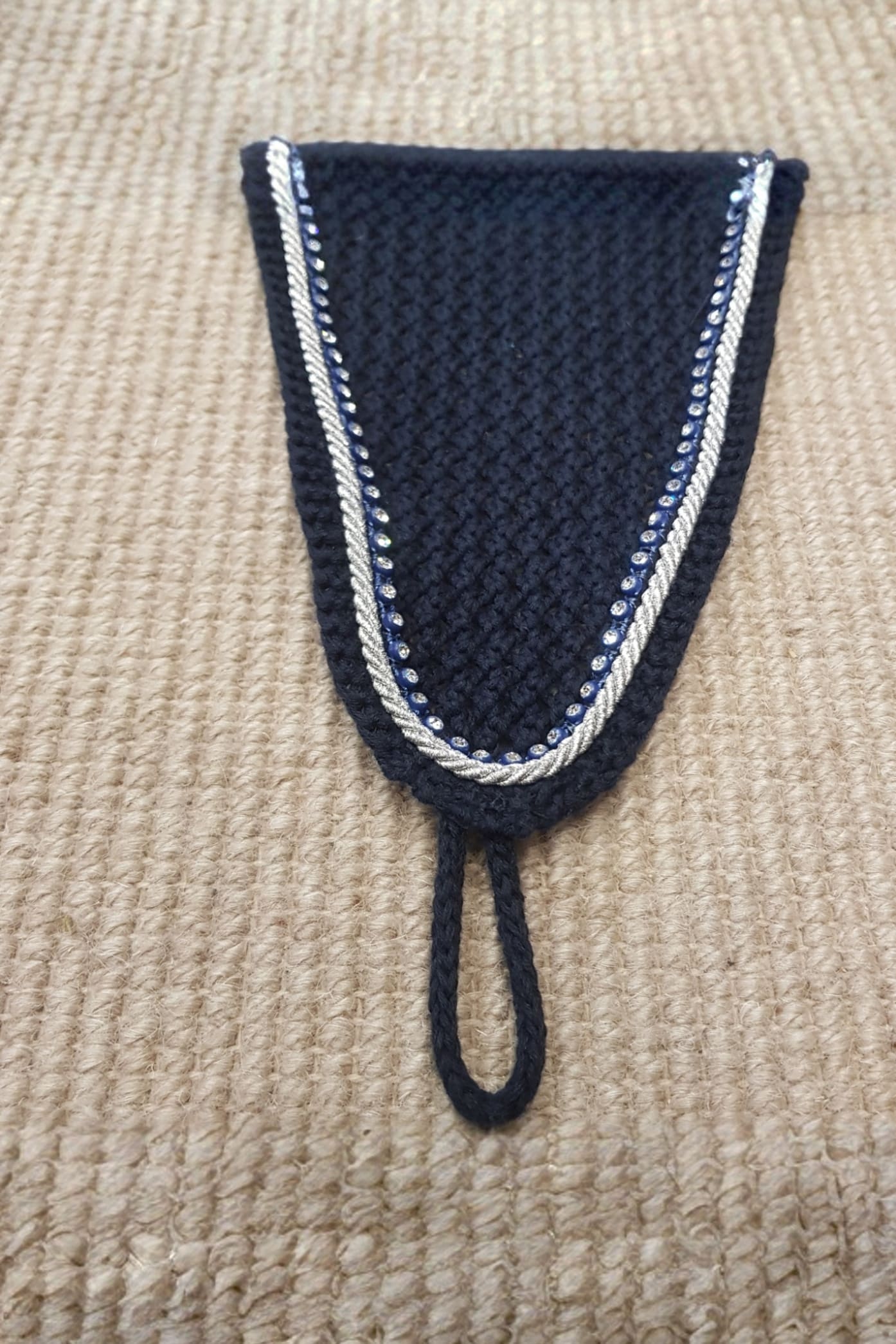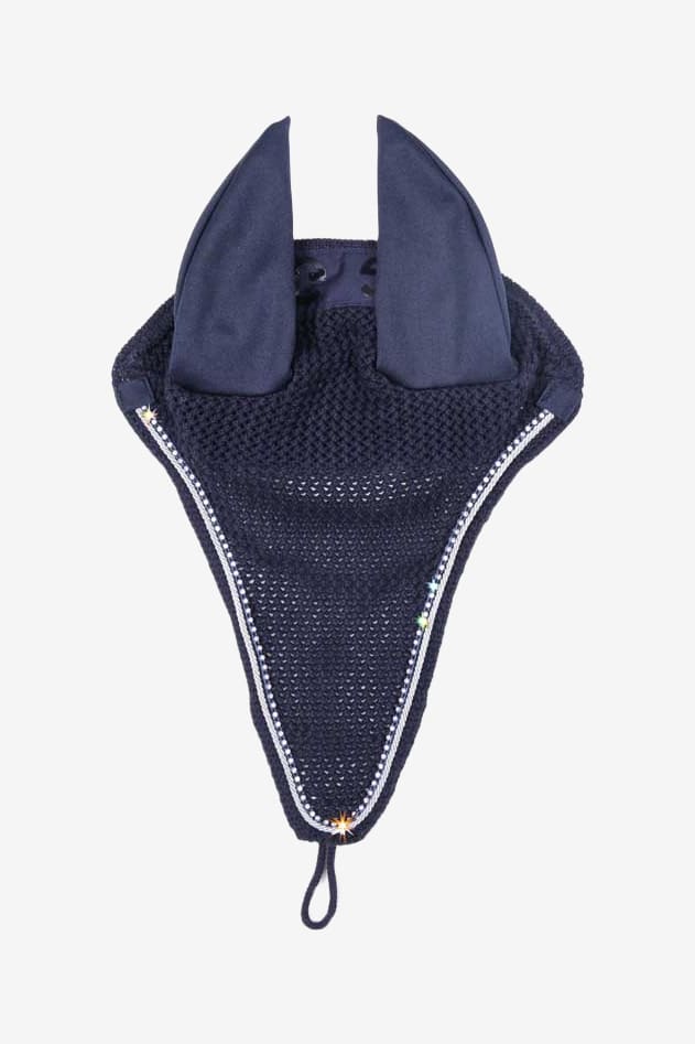 Virkad huva i lång modell med två passpoaler av kristaller och silver längs med kanten. Ögla längst ned för att fästa i nosgrimman för att förhindra att huvan åker upp. Elastiska öron för ökad komfort för hästen. Nackstycket är försett med GG-logga i silikon som hjälper till att hålla luvan på plats utan att den glider fram över öronen.