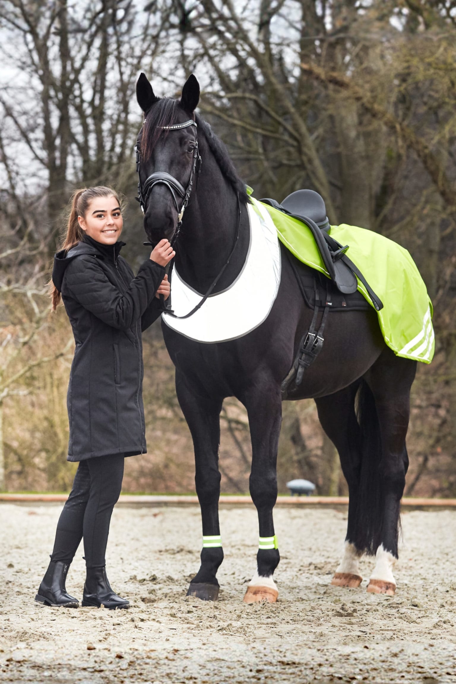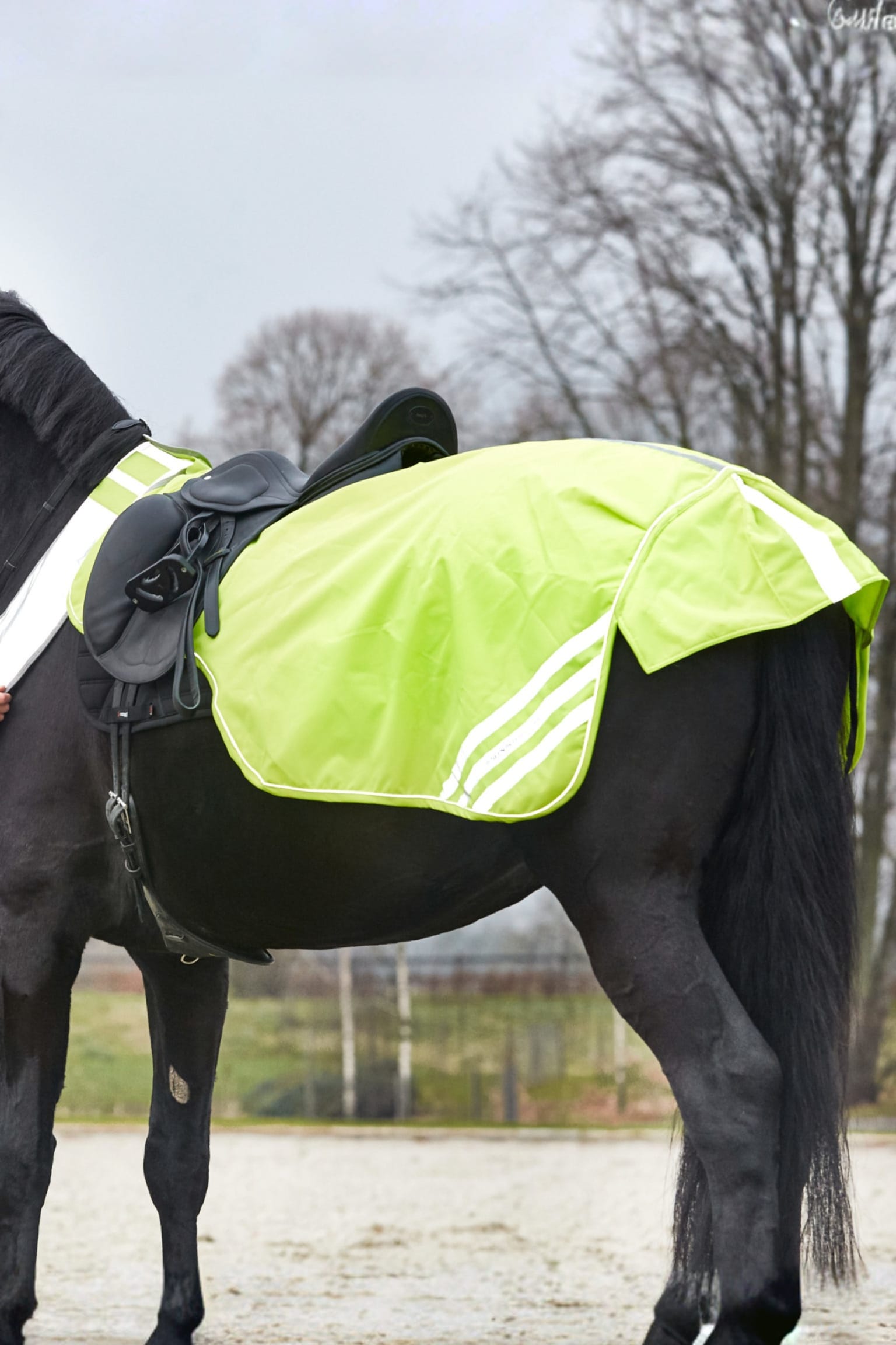 Reflex skrittäcke i en gul färg med reflex band baktill samt på sidor. Fäste framtill med kardborre för att hålla täcket på plats. Regnavisande material som är perfekt i höstrusket. Fleecefoder på insida för att hålla värmen.