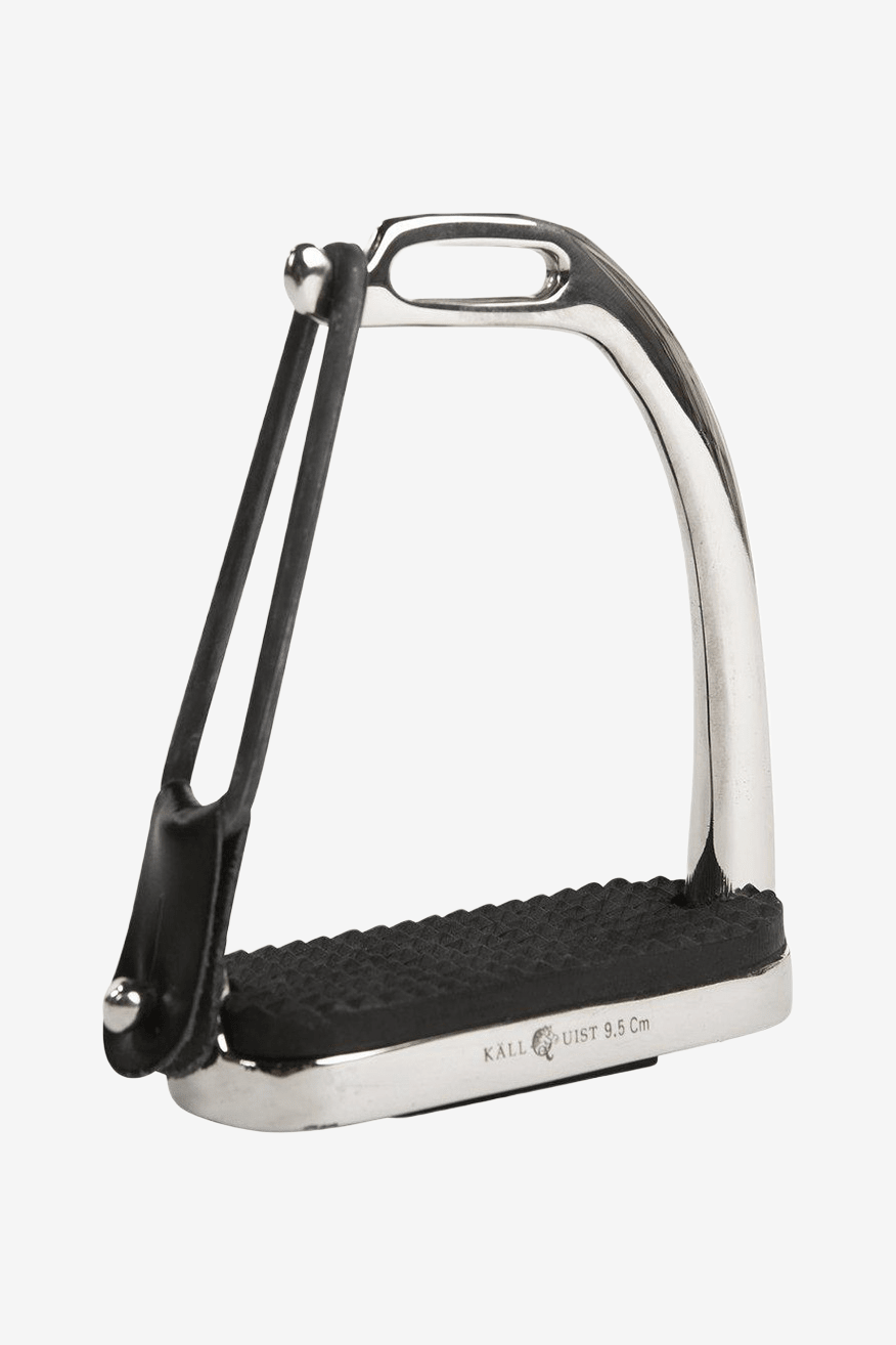Säkerhetsstigbygel från Källquist Equestrian. Tillverkade i rostfritt stål med gummiplatta. Gummiband på sidan.