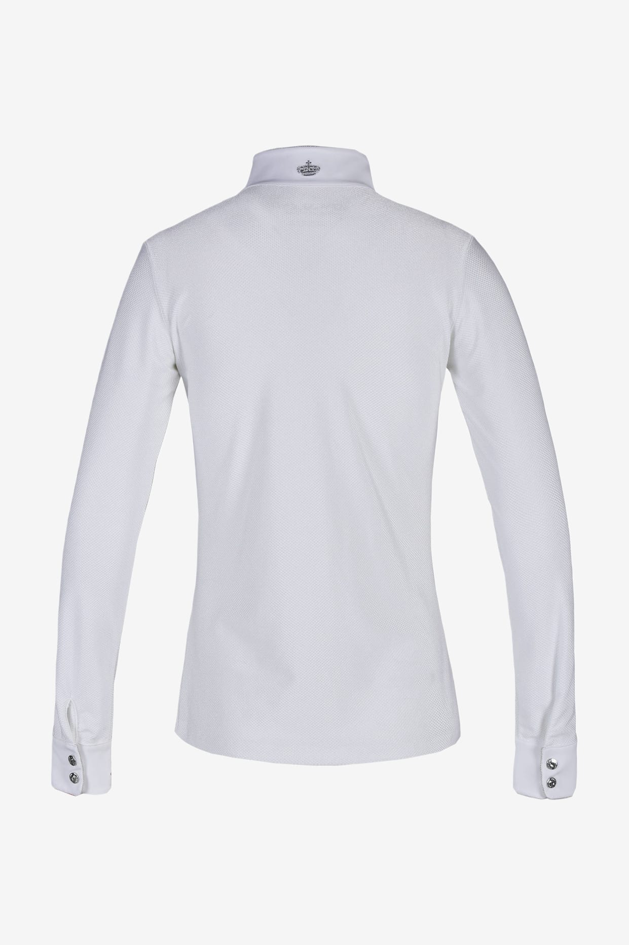 Tävlingsskjorta till junior från populära Kingsland i ett strukturerat glänsande material. Tyget andas och har tekniska funktioner som snabb torkfunktion och fukthantering. Optimalt för bästa prestation på tävlingsplatsen. Krage, knäppning och ärmslut är i vävt tyg. Kragen och ärmsluten är dekorerade med kedjor och tryckknappar med kristaller. Broderad logotyp snyggt detaljerad med kristaller på.
